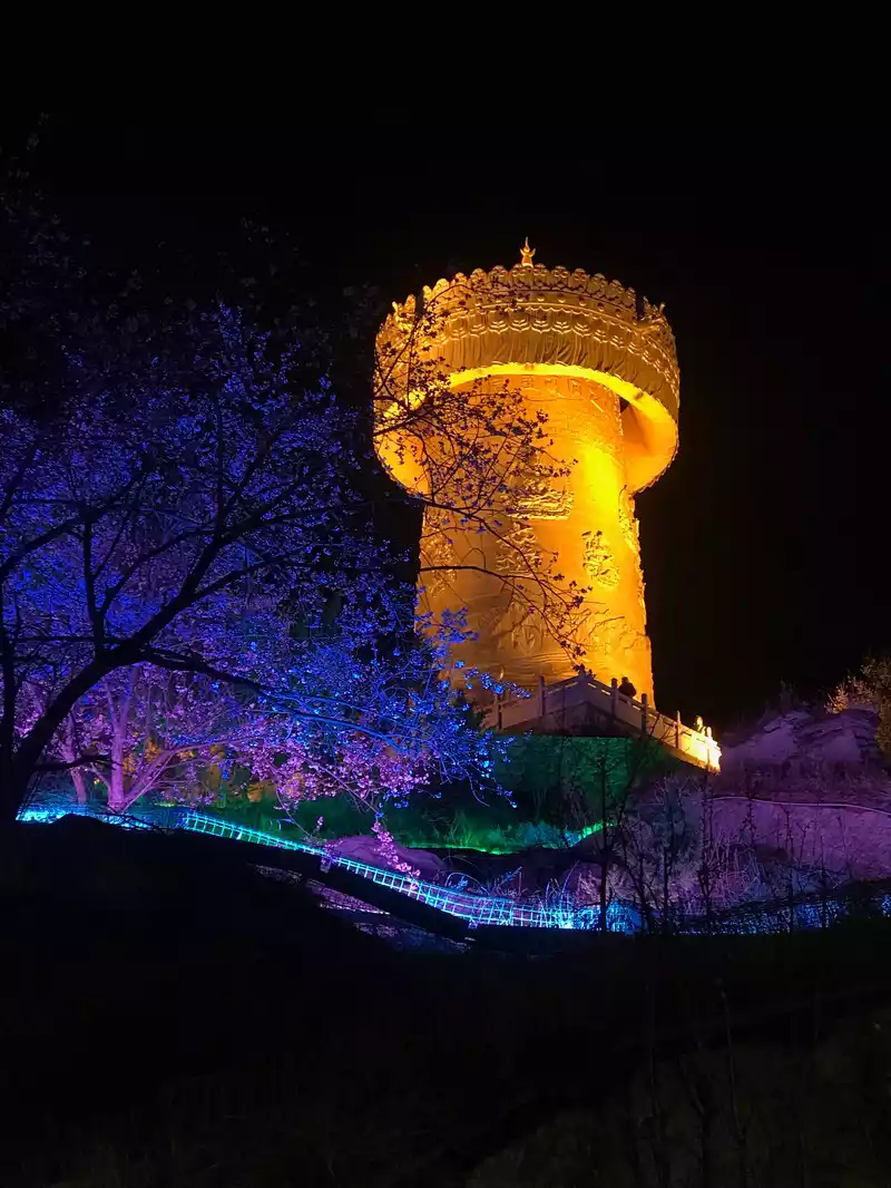 The ancient city of Dukezong The world's largest prayer wheel, about 5 stories high, the cylinder body is pure copper gilded, and the upper end of the tube wall is engraved with relief seals engraved with Manjushri, Puxian, Guanyin, and Ksitigarbha Bodhisattvas, and the lower end is engraved with the Eight Treasures of Buddhism, and the tube also contains a total of 1.24 million mantras, wordless mantras, etc. and 16 tons of various Buddha treasures. There is a ring of handrails under the prayer wheel, which is used by people to push the prayer wheel. In order to turn such a huge prayer tube, everyone needs to work hard at the same time, and every week is equivalent to silently chanting the Buddha's name 1.24 million times, and after three weeks, you can eliminate disasters and pray for blessings, and you can pray for good luck.