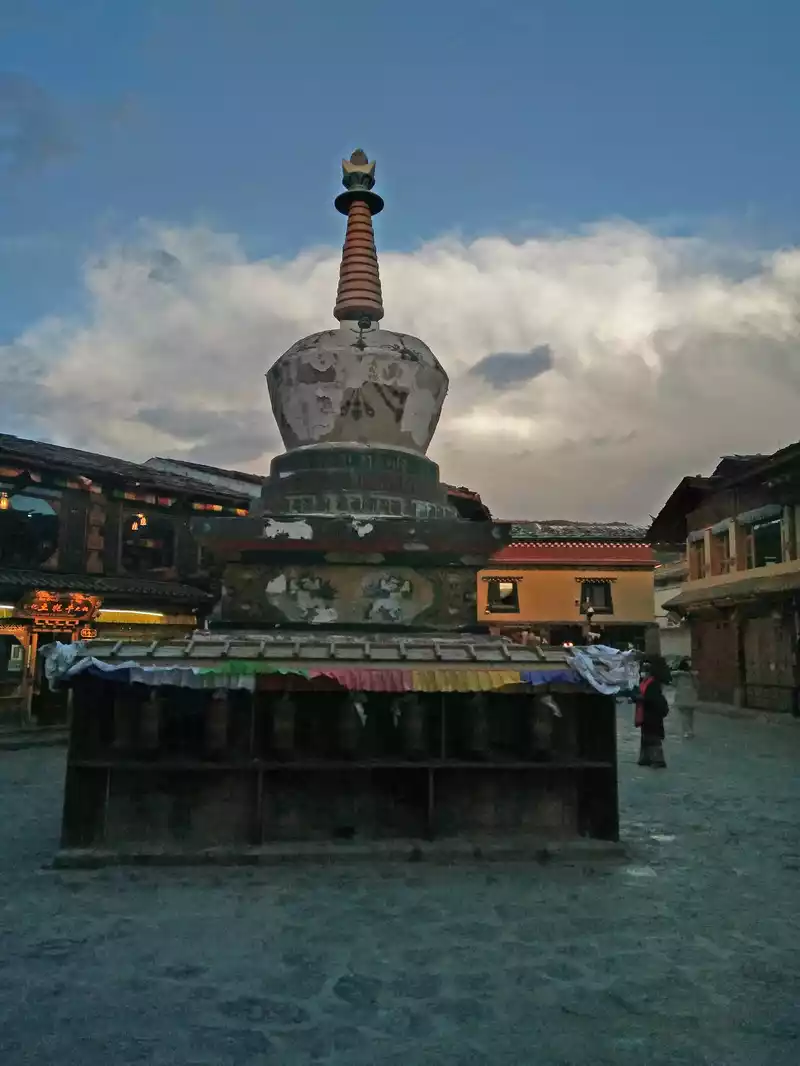 Dukezong Ancient City In the evening, on the top of Guishan Park in the ancient city of Dukezong, Chaoyang Tower + the world's largest prayer wheel.