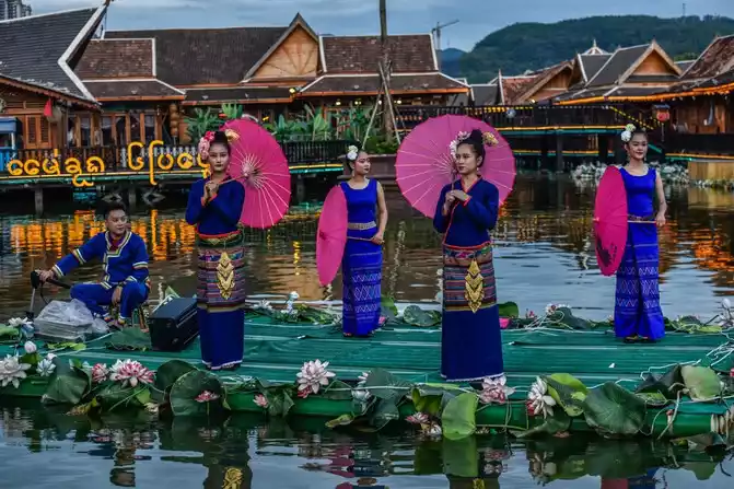 The frequent exchanges between Xishuangbanna and the other five countries have formed a situation of similar cultural customs, in order to show the style of water trade in the six Southeast Asian countries, Xishuangbanna built this six-country floating market on the north bank of the Mekong River. When we see the words "Mekong Floating Market" written in Dai on the wooden house, it is even more exotic.