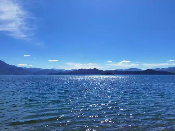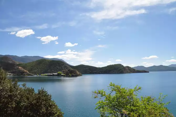 distance from Lijiang to Lugu Lake is not far, only about 200 kilometers, but almost the whole process is a winding road, so the speed is not fast at all, and the average speed is basically about 50 kilometers per hour. The altitude of Lugu Lake is about 2,600 meters, when I entered the gate of Lugu Lake Scenic Area and went straight down to Lugu Lake along the winding road, the blue lake suddenly appeared in front of me, so beautiful that you can't wait to stop immediately and look at it affectionately.
