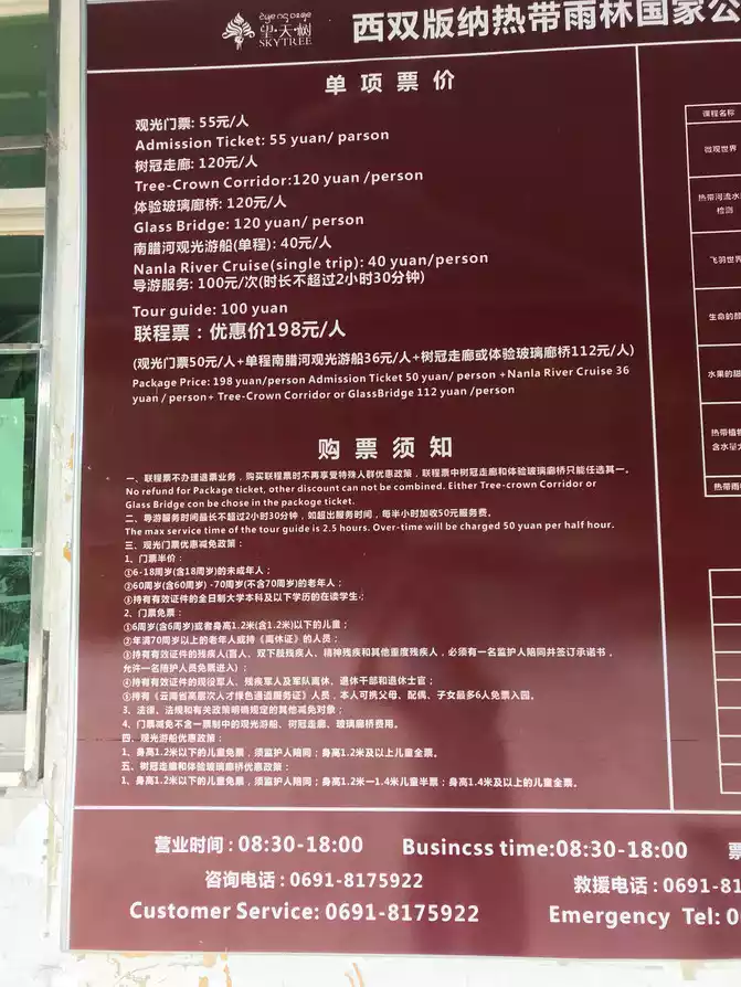 Tickets: package 198 yuan (including the gate of the scenic spot, one-way Nanla River sightseeing cruise, canopy corridor, rainforest covered bridge) Official website ordering has preferential