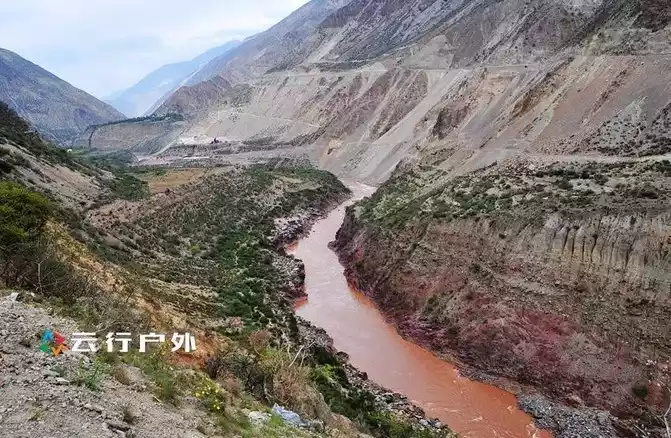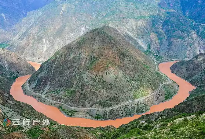 After lunch, after lunch and walking forward from Benzilan for twenty minutes, you will see the big bend of the Jinsha River - Moon Bend, because summer is the rainy season, and a lot of muddy water rushes into the river , so the Moon Bay seen this season is red.