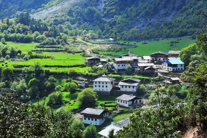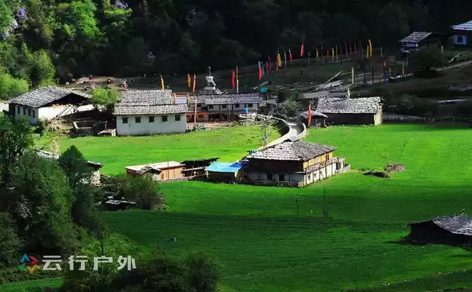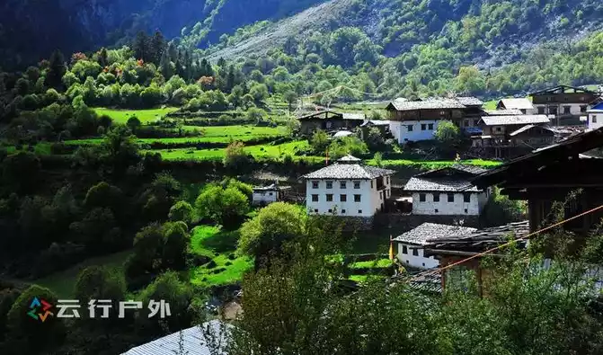 catches your eye after walking for about two hours from Nanzongya Pass is Yubeng Shangcun, where several white Tibetan houses stand on the green hillside. It is harmonious and unified with the surrounding natural environment, forming a beautiful and peaceful scenery of Yuben Upper Village.