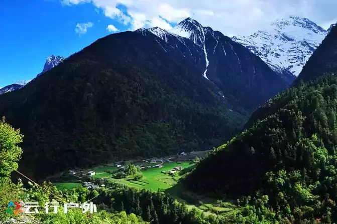 Standing in Yubeng Upper Village, you can see the panoramic view of Yubeng Lower Village, the quiet Yubeng Lower Village under the snow-capped mountains is a green equilateral triangle, surrounded by valleys on three sides, There are some small white houses dotted in the green valley, which are the homes of local Tibetans, but most of them have now been converted into inns.