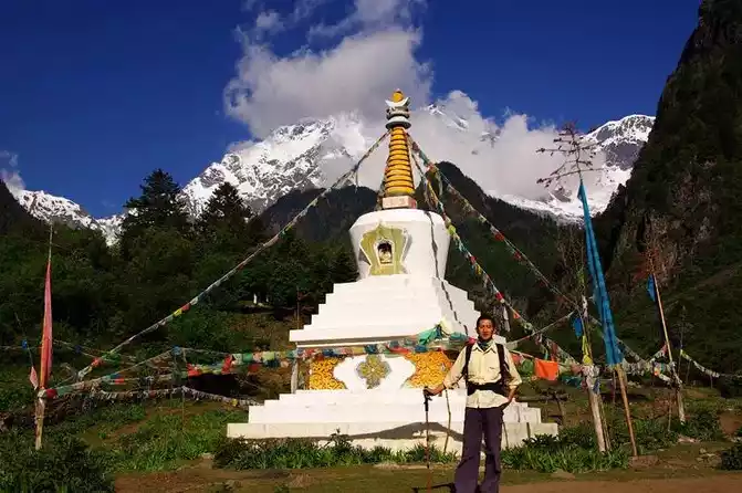 After admiring the Rizhao Golden Mountain in Yubeng, we will start to another important destination in Yubeng, Xiaonong Base Camp and Ice Lake. With a one-way distance of 12 kilometers and a round trip of 24 kilometers, this is the striking white stupa in Yubeng Shangcun and can also be used as a starting point for hiking.