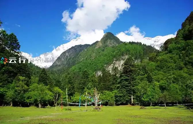 The alpine meadows passed before entering the primeval jungle, where various religious ceremonies are held on major Buddhist festivals, Behind the meadow are lush primeval jungles and white snow-capped peaks, and the ice lake at the foot of the snowy peaks is our destination today.