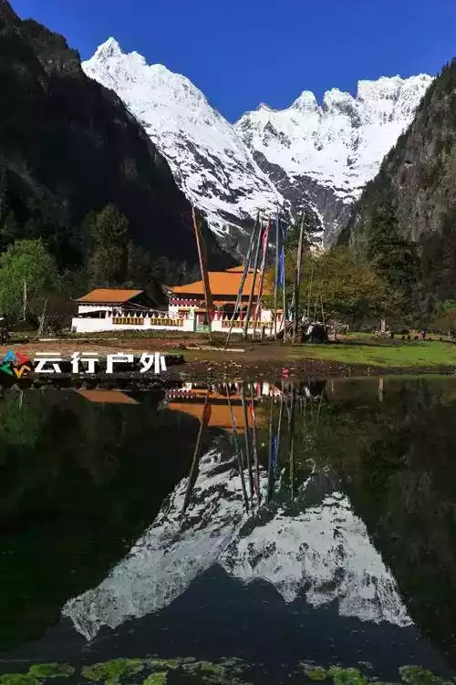 Snow mountains, temples, blue sky, reflections, can be found in Yubeng Lower Village.