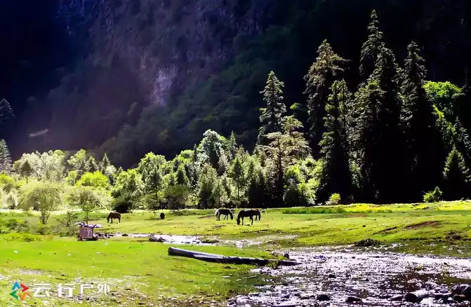 The quiet rain collapses down the village, the alpine meadows in the primeval jungle, bathed in the golden morning light of the morning, and the clear stream flows quietly between the meadows, Yaks and horses are quietly foraging on the grass, and a poetic landscape picture is presented before our eyes.