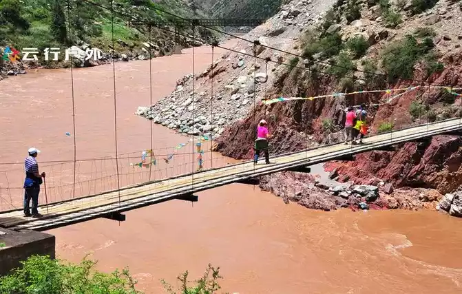 Crossing a suspension bridge over the Lancang River, which is also a suspension bridge for local villagers to the other side, the bridge is very small and can only be crossed.