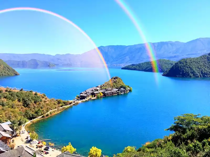 There is an observation deck on Rig Island, and from the observation deck, the entire Rig Peninsula and Lugu Lake form a huge "heart". This is also the most classic scenery of Lugu Lake.If you're lucky, you can also see the rainbow after the rain in Lugu Lake~
