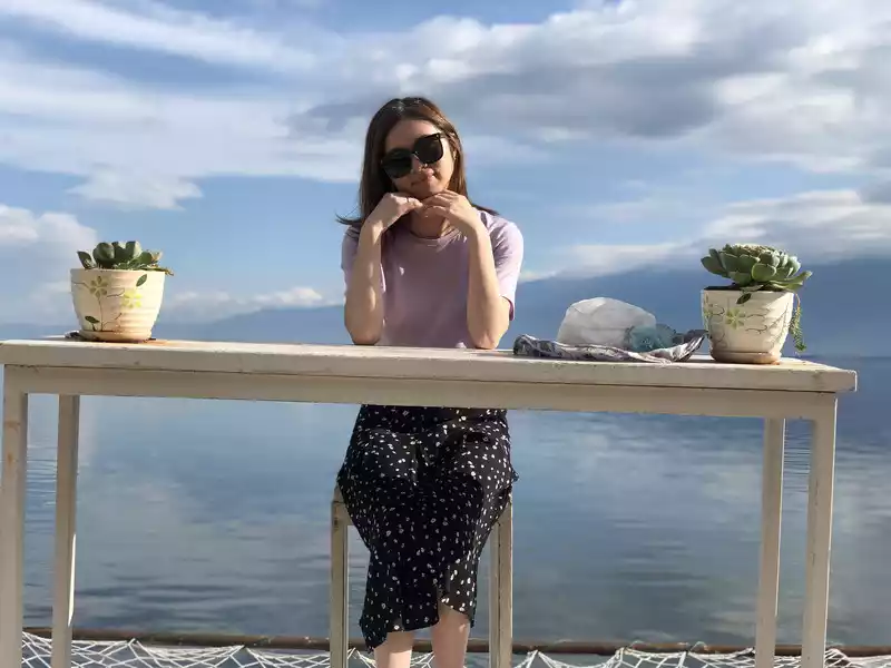 We started walking and wandering around from one end of Shuanglang Ancient Town, and then took a boat to Nanzhao Style Island, where there are very classic Internet celebrity photo spots, that is, long white tables and transparent hemispherical hanging chairs with the sea as the background. But the hemispherical hanging chair costs money to shoot, and we didn't go in.