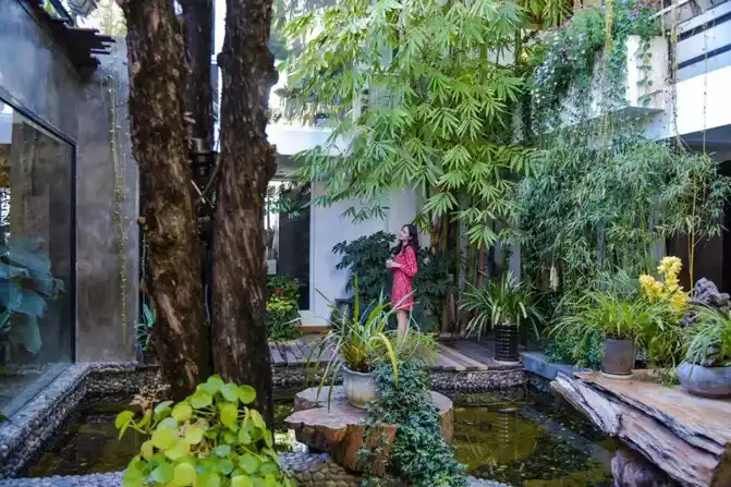 who would have thought that a courtyard wall would be painted in such a bright and lovely color.