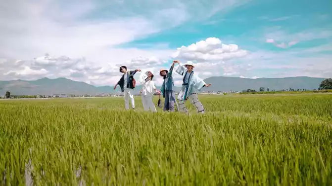 , rice fields, starry sky, hillsides, blue sky, white clouds, tile houses, ......