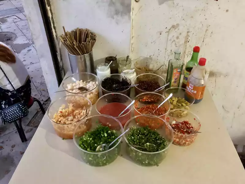 Finally, I would like to recommend a rice noodle to you, there should actually be a lot of this kind of morning and evening ordering shop, but we have only been traveling for a few days, it is not easy to touch, if you see it, you can taste it, 8 yuan a bowl, the ingredients are self-service, much more delicious than 20, 30 a bowl in the scenic spot.