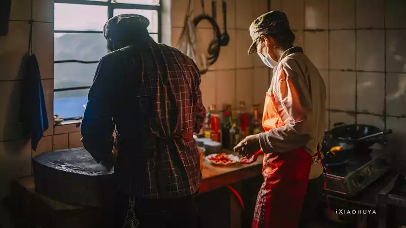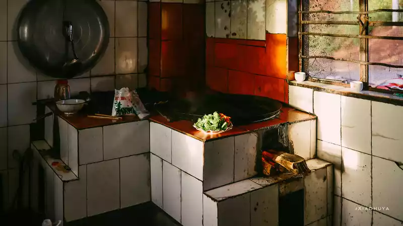 The kitchen is rudimentary and the scenery is extravagant. The house is located on the top of the mountain, and the kitchen window is extremely open, and you can see the mountains in the clouds in the distance without any obstruction. The sun poured in from the small window, just shining on the wood stove, a few cut ribs were rolling in the oil, and a plate of green broccoli had not yet been put into the pot.