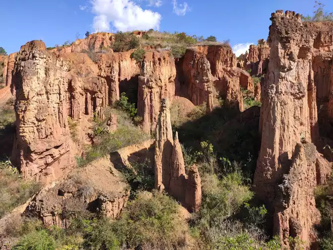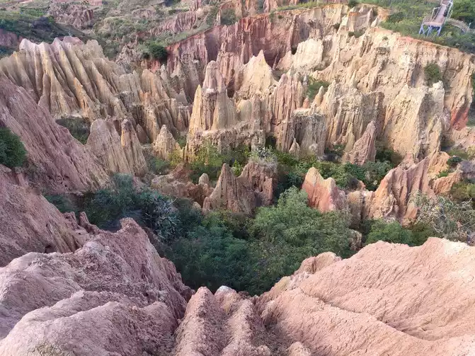 Use Didi taxi for 16 yuan to Dali Bus Station (this bus station is located near the train station), take a minibus to Nanjian Yi Autonomous County, the "hometown of jumping vegetables" for 32 yuan, drive 3 hours to Nanjian Bus Station, and charter a small minibus to Tulin + Cherry Blossom Valley in the bus station, spending 400 yuan, almost noon, the driver took us to lunch, and made a bowl of noodles for 10 yuan. Nanjian Tulin is located around the dam of the Nanjian River Valley in Nanjian County, Dali Prefecture, Yunnan Province, with a total of four or five scenic spots such as the foot of the western mountain, the general fuzhuang, and the camp. The Nanjian Tulin in the sun is a beautiful oil painting. The lines of different thicknesses undulated with the mountains, the bright colors, very much like the oil painting master splashed ink at will, sometimes golden light, sometimes yellow like orange, the grass and trees growing in it, green to make people happy, look at the shape of the earthen forest, some are like shy beauties, some are like tall men, some are like big Buddhas, some are novices, some are like mushrooms growing in patches, it can be described as a thousand changes, it is dizzying. The overlapping combination of earthen peaks and earthen pillars, with rough but delicate brushstrokes depicted the scenery, the ravines and caves are staggered and orderly combined, and the style depicted with real and ethereal brushstrokes can be described as diverse techniques and endless styles. In order to facilitate tourists to watch, Nanjian Tulin has also built a 168-step plank road directly to the Wuliang Tower, a plank road and stone road with a width of 1 to 2 meters and a total length of 1.8 kilometers, installed 130 courtyard lights, 280 flood lights, 990 point light source lights, built a parking lot of 4,109 square meters, and carried out a series of projects such as afforestation and greening of the scenic spot.