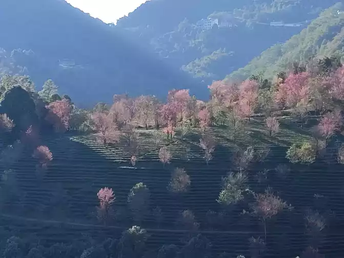 It takes 1.5 hours to drive from Nanjian Tulin to Cherry Blossom Valley, arriving at the scenic spot at about 15:45, and Wuliangshan Cherry Blossom Valley currently only charges parking fees and does not require tickets. The cherry blossom blooming period is from the end of November to the beginning of December every year, about 25 days, and the cherry blossom valley covers an area of about 2,000 acres. In the beginning of "Tianlong Babu", Duan Yu mistakenly entered the Infinite Sword Lake Palace, entered the stone cave to see the statue of the fairy sister, and practiced "Lingbo Micro Step". This was originally a large tea garden, and while planting tea trees, winter cherry blossoms were also planted to shade the tea trees and improve the tea garden ecosystem. The cherry blossom trees grow, bloom in the twelfth month, and are full of arbitrariness, which complements the green and neat tea gardens, forming a cherry blossom scene, and gradually, everyone calls this place "Cherry Blossom Valley". The entire cherry blossom valley is roughly divided into three parts, called No. 1, No. 2 and No. 3 scenic spots. In fact, from the top of the mountain, the mountainside, to the valley, and even the mountain flower village at the bottom of the valley, there are patches of winter cherry blossoms. The observation deck of Scenic Area No. 1 may be a better viewing position, overlooking Scenic Area No. 3 from a distance, or overlooking Scenic Area No. 2 in the valley. The "panorama" of Cherry Blossom Valley that frequently appears on the Internet is actually the No. 2 scenic spot overlooked, almost taken from this area. Li Mengbo's suggestion is to walk from Camp 1 to Camp 2 first, where it is more convenient to connect by road; Then return to Scenic Area No. 1 to guard the sunset of Scenic Area No. 3 opposite, and combine it with the top of the mountain to take pictures, you can have a multi-angle understanding of the winter cherry blossoms. If time does not allow, don't go to the No. 3 scenic spot, when the sun sets, it goes down from the mountain behind the No. 3 scenic spot, so after almost 16 o'clock, the No. 3 scenic spot gradually darkens. I took the car back to the county, ate a dinner of Nanjian black-bone chicken for 66 yuan, and finally went to Yunzhi Shang Hotel for 108 yuan.