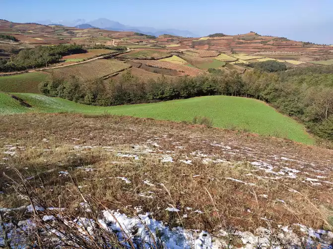 had a train to the red land at 7:50 a.m., rushed to the passenger station early in the morning, and spent 43 yuan to buy a ticket. But the bus never came, and after waiting for a full 30 minutes, the bus was late, with only 5 or 6 passengers. After leaving the passenger station, the car drove for a while, turned two corners, stopped on the side of the road, and the car was full in an instant. After another 3 hours, I arrived at the Kunming Red Land Old Star Hotel, which is the home of the red soil old man who will automatically match the red soil if you search for the red land, the accommodation fee is 96 yuan, the lunch is 10 yuan, and the other party is also very friendly, such as helping me carry my luggage, and the cooking dishes are also given to me a lot (I can't eat it), take a short rest in the hotel, go out after 14:30, and charter a car for 200 yuan (including early sunrise tomorrow and today's sunset). First go to the red clay image, the old dragon tree, the splendid garden, Luoxigou There is a relatively complete observation deck, return to the music hollow and tile house at 16:30 to take pictures of the sunset scenery, there are also large wind turbines on the mountain, which also embellish the uniqueness of the mountain. Dinner is 40 yuan, there is only an electric blanket at night, the water is very cold, and I don't dare to take a bath, for fear of catching a cold. Make an appointment with the driver, and go to Makan to shoot the sunrise at 6 o'clock on the second day, the sunrise is not ideal, and the observation deck is also being built here, blocking the view; On the way back, we passed through the colorful slope, which was also very beautiful and left good memories. At 8:30, from the hotel gate, the shuttle bus returned to Kunming for 43 yuan (ask the boss to contact the driver one day in advance and get on the bus at the hotel gate). After arriving at the northern passenger terminal of Kunming, there is a subway next to it, and I went directly to the airport for 6 yuan, and returned in time for the 19:45 flight in the evening, stopping at Bijie on the way, ending this unforgettable trip.