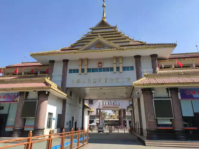 Today's itinerary is very rushed, and the departure in the morning is delayed, so I can only leave the Silver Pagoda in a hurry, the next attraction is the tree wrap tower, an urban attraction, navigation is almost 10 minutes, the surrounding of the tower is the parking lot, it is really parking to visit. The tree wrap pagoda is a Dai-style pagoda, formerly known as the Tiecheng pagoda, built to commemorate a war, the pagoda is a solid brick pagoda, covered by tree roots, so it is called the tree wrap pagoda, which is the earliest pagoda built by the local Dai people. The magical and chic tree wraps the tower, the tower body is like a standing Vajra, majestic and magnificent, and the majestic Bodhi tree is like a giant umbrella that opens up to protect the top of the tower. The thick crown stretches out to the sky like an arm, the bronze trunk is strangely curved, tightly wrapping the tower body, the tree wall is like a waterfall falling to the ground, bathing the tower base, the tree wraps the tower, the tower embraces the tree, interdependent, reflecting each other, forming a unique tree wrapped tower wonder, well-known in western Yunnan and Southeast Asia. There is a primary school next to it, and it is school time, and the roadside is full of primary school students, who carefully drove away from the school district, and then left Mangshi and went to the border of our country - Ruili. Ruili City is 1.5 hours away from Mangshi and is the terminus of the Hangrui Expressway, which is connected to Myanmar's mountains and rivers, facing villages, and adjacent to Myanmar's national port city of Mujie. Ruili is the largest inland port in southwest China, an important jewelry distribution center, and one of the first excellent tourist cities in China. Ruili is also one of China's 17 international dry port cities and the first stop for China-Myanmar oil and gas pipelines to enter China. The first attraction is the sister to sue the country, stay here for 20 minutes, and there is a parking lot in front of the national gate, which is very convenient. The sister is a Dai language, which means the old city, and implements a special supervision model of "inside and outside the border", and there are well-known "China-Myanmar Street", "Ruili Port National Gate" and "End of the World". According to locals, Burmese can work in Dehong Prefecture, but they cannot leave Dehong, otherwise they have to hold a passport, and a passport requires a large fee for Burmese locals. The "End of the World" monument is in a corner of the national gate, donated by an XX company, and I can't figure out why this stele has become a check-in attraction.