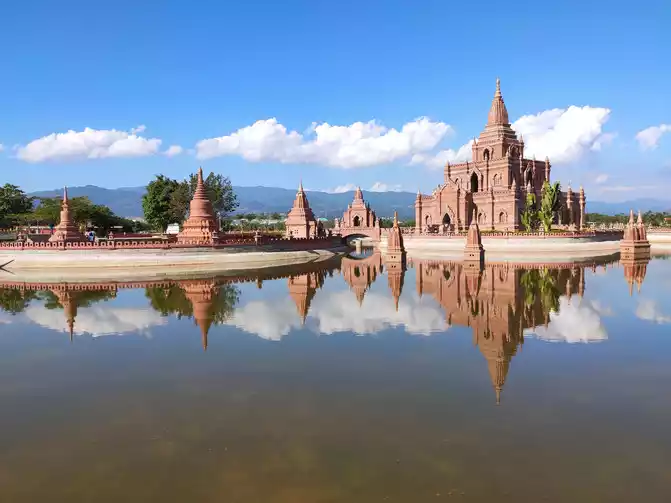 The "Menghuan Shwedagon Pagoda" is golden and dazzling, and it is an iconic building in Mangshi and a holy place for the Dai people living here. Legend has it that Shakyamuni lived here when he was reincarnated as the Golden Rooster Alan during his lifetime, and the Menghuan Shwedagon Pagoda was destroyed in 1966, and the current Golden Pagoda was rebuilt in 2007. Menghuan Shwedagon Pagoda is located on the top of Leiyarang Mountain at an altitude of 1,079 meters on the shore of Peacock Lake in the southeast of Mangshi, and the momentum is majestic, and you can see the golden top of the tower when you stand at the foot of the mountain. In front of the gate of the Golden Pagoda Mountain, two golden dragons flew all the way down the hillside and turned into two giant claws in front of the Golden Pagoda. Climbing up the steps from the mountain gate, you can see the five big characters of "Menghuan Shwedagon Pagoda" shining, surrounded by carvings of peacocks, Buddhas, magic tools, etc., the golden color is in the sun, some dazzling, solemn and a little lively. Shwedagon Pagoda is the largest main building in the temple, in the style of the Dai palace in South Asia, with a splendid appearance, white marble walls, and stairs up and down on the side, like a beautiful garden. The Shwedagon Pagoda is 76 meters high and is an octagonal four-door hollow stupa with a total of four floors, but in fact, the lower three floors are hollow halls. There are 8 small towers built on the second and third floors of the Shwedagon Pagoda, and 8 vase towers are also built on the outer platform of the fourth floor, which surrounds the central golden dome, which not only enhances the momentum of the main tower, but also beautifies the Shwedagon Pagoda. The Shwedagon Pagoda has four gates, all of which can be entered. Before entering the main hall, you need to take off your shoes. There is a circle of corridors for tourists to rest around the Shwedagon Pagoda, which can overlook the entire cityscape of Mangshi, and the mountain breeze blows on the face, which is very comfortable. There is also a noteworthy attraction in the scenic area - the relief of the reclining Buddha. On the right wall of the gate, a statue of a giant Buddha lying down is peaceful and kind, and the golden robe is mixed with the green mountains and trees, transforming nature. In addition, there is a Bodhi tree next to the pagoda, which is the third generation of the Bodhi tree that Shakyamuni enlightened and became a Buddha more than 2,000 years ago, and later spread from India to Sri Lanka, but it was full of vitality. This sapling was introduced to Xishuangbanna, Yunnan Province from Sri Lanka in 2005, and is currently planted in Banna, Kunming and Dehongmang City.
