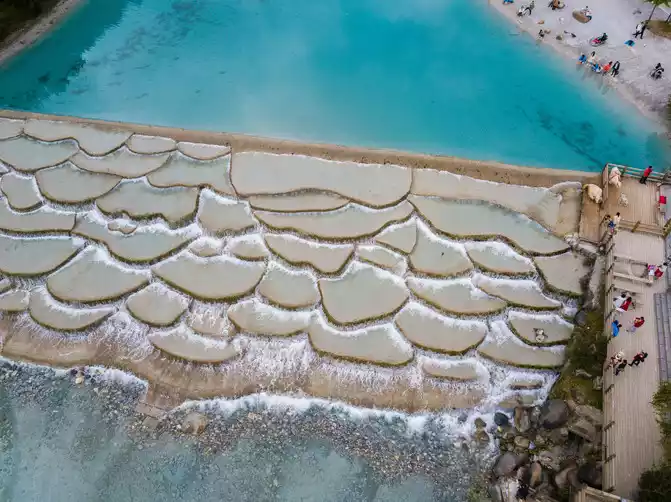 Standing on the side of the road and looking down, it's really beautiful. The lake water is this light blue color, and the reason for this blue color is that the sediment at the bottom of the lake is white. It seems that everyone has done a strategy, and when I saw a large group of girls in white dresses taking pictures, I almost thought they were having a group wedding. It looks good to take pictures here in a white dress, but it's not bad for me to wear red.