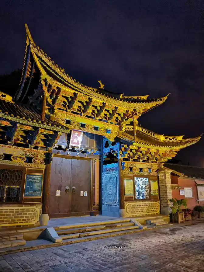 Not far west along the street from the Star Arch Tower, you will come to the gate of Weishan Confucian Temple. Under the reflection of the halo street lights, the gate of the Weishan Confucian Temple with carved beams and painted beams is beautiful.