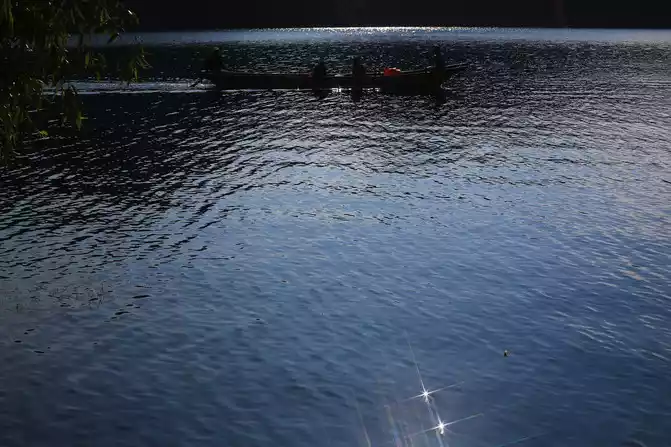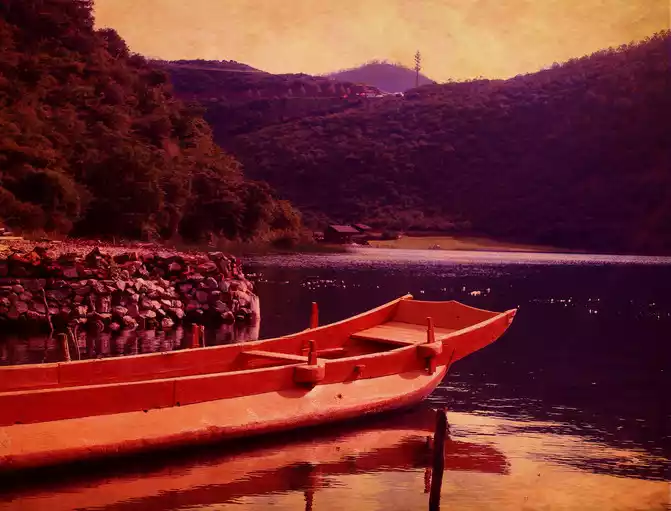 setting sun flat boat sunset, the boatman rocking the oars breaking the water, the distant mountains and flat lakes are boundless, and the sky is picturesque.