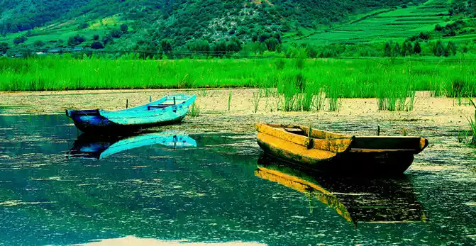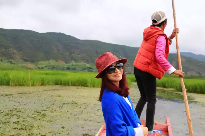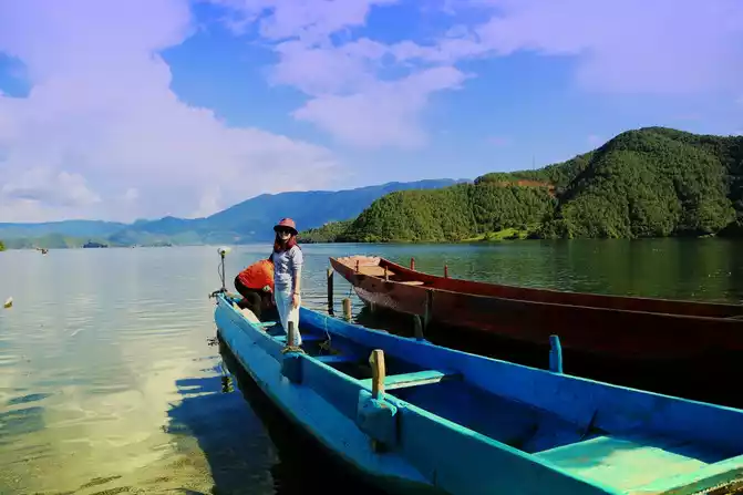 Find a boat to sit on, The boatman sang happily and waved the oars to take us to the center of the lake, and the boat lady on the opposite boat also sang local folk songs, the sound was crisp and loud, reflecting the mountains and rivers.