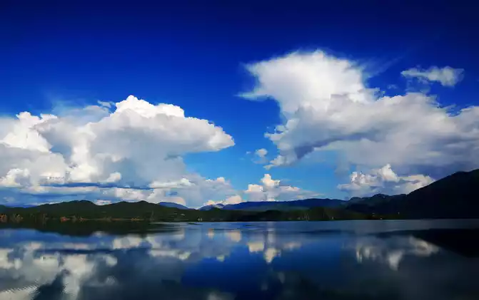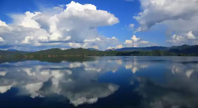 boat in the middle of the lake rowed leisurely, A large mass of white clouds hung in the sky within reach, and the reflection was reflected in the water, and it did not change shape for a long time, and it was so lazy to move the position.