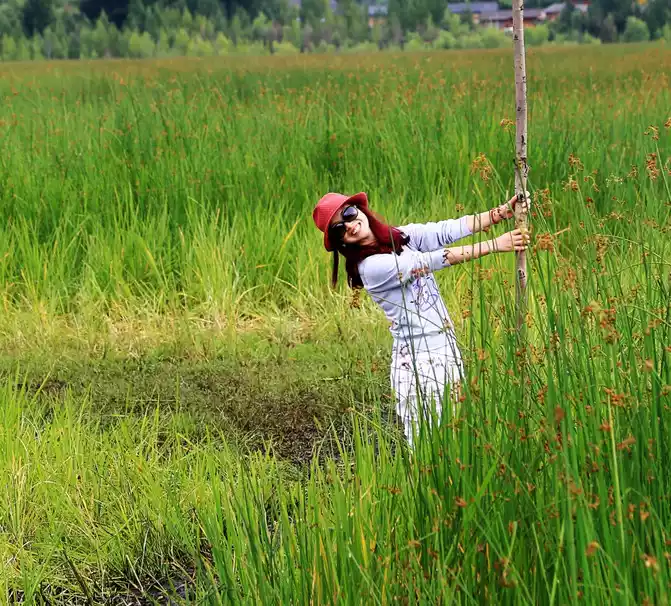 In the meadow, take a boat into the middle of the meadow, and there is a large meadow poured into the lake. Take off your shoes and step on it, the wet and soft meadow, take a step, sink down, I'm really afraid that I will use too much force, the whole meadow will sink completely, sometimes one foot deeper, there will be black mud floating on the top of the feet, with a slight temperature and some strange feelings. In fact, the grass was dense enough to support the weight of a large group of people, and they fell into the lake in a staggered manner, neither withering nor standing and growing.