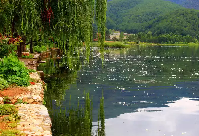 In the dream, the sky and water are connected, and the white flowers are like beauties, blooming in the water. The floating clouds, when did they know how to take care of their shadows and feel sorry for themselves, gathering and dispersing with the wind and stopping. The village is hidden in the mountain hollow, you can hear the dog barking and the rooster crowing, the horse galloping, and the mountain road is winding endlessly. Time is stranded on the peninsula, the years are silent, and the dust is silent.