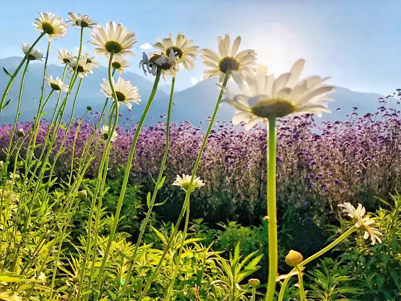 Purple, yellow, blue, white and pink flowers are all over the place, stunning your vision.