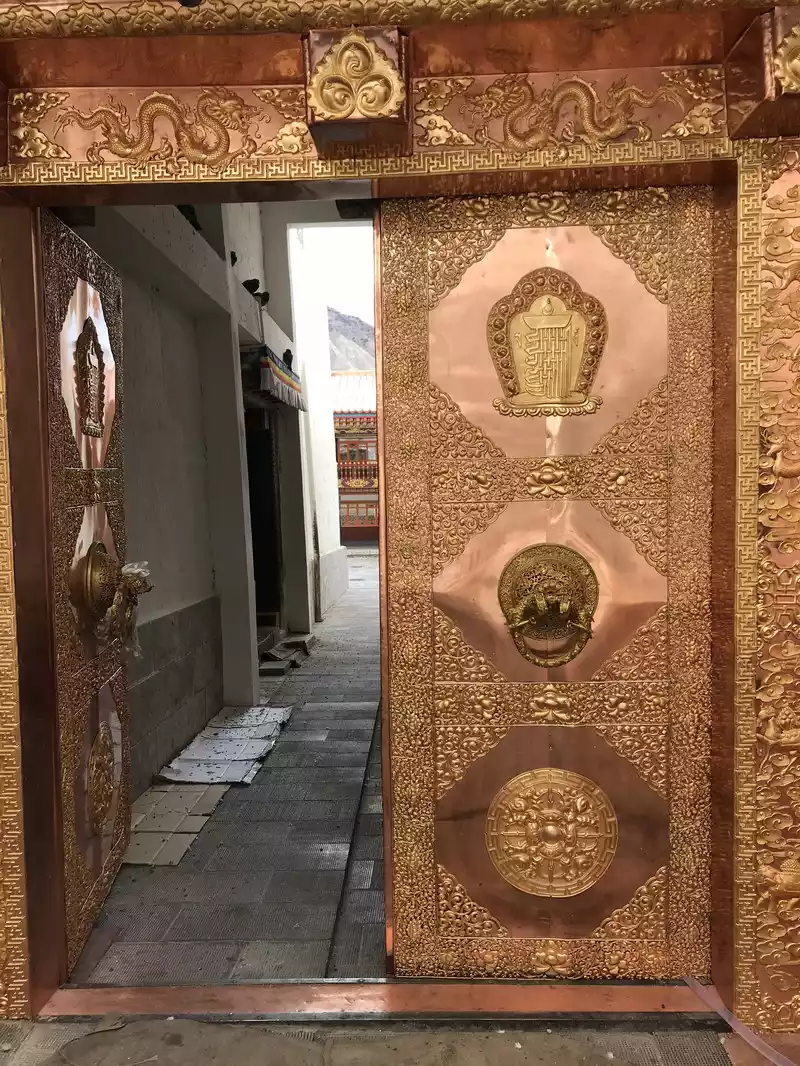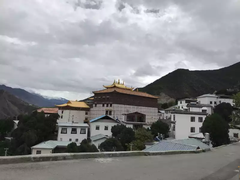 Dongzhulin Temple is located in the mountain hollow on the side of the highway, and from a distance, it is a house with white walls and black tiles, and only the golden roof of the temple itself shines. Tickets are 20, locals are free of charge, after entering the gate, there is a section of cement slope up and down, on both sides are small houses, different sizes and decorations, most of them are Tibetan-style fancy and complex doors and windows, it looks like hand-painted, and occasionally there is an ordinary style without decoration, and there are often a few big roosters with red feathers pacing in front of the door. Master Yu said that these were the residences of the monks of the temple. He said that the monks of the more famous Songzanlin Temple and other temples had disputes over the money of tourists, so now the locals will only come to Dongzhulin Temple to worship Buddha, and in my opinion, the act of collecting tickets itself also has a certain smell, but fortunately, there is no vulgar program such as asking for incense and fortune-telling in the temple.