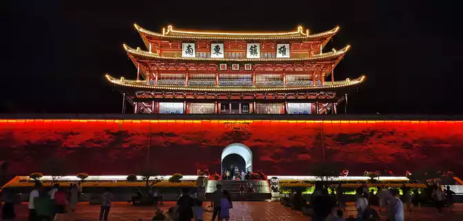 After a sumptuous dinner, visit the night view of Jianshui Ancient City. This is the Yinghui Gate of the Jianshui Ancient City Tower, majestic and majestic, with "Xiong Town Southeast" on the "Chaoyang Tower" above, and "Jinxia Flowing Clouds" on the back The building was built 28 years earlier than Tiananmen Square in Beijing, and the architectural style is a combination of Yuan Dynasty architecture and Ming Dynasty architecture, and the scenic spot is located in the center of the ancient city, facing east from west to east, which was originally a military fortification in the eastern part of Lin'anwei in the Ming Dynasty. Chaoyang Tower can be called a treasure of ancient architecture, and the first floor of Yunnan Mansion is a symbol of Jianshui, a famous historical and cultural city in China.