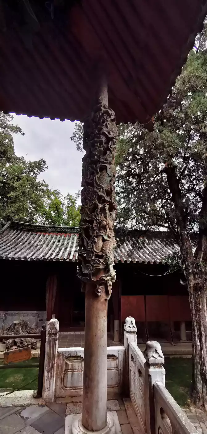 Dacheng Hall, which is supported by 28 pillars. The 12 front eaves are stone poles, each 5 meters high and weighing 5,000 kilograms, carved from a whole piece of large bluestone. There are two eaves on the left and right of the gate carved with dragons, called "stone dragon pillars".
