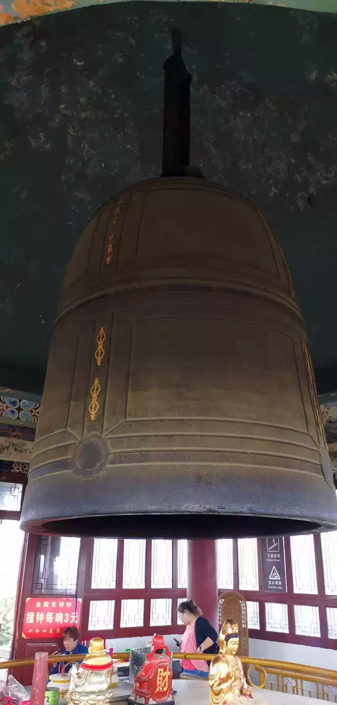 On the third floor of the Golden Hall hangs a large bronze bell, 2.1 meters high, with a diameter circumference of 6.7 meters, a wall thickness of 15 centimeters, and a weight of 14 tons, making it the third largest bronze bell in China. The bell is cast with the words "Made on the auspicious day of the second spring of the Ming Dynasty Yongle", which was cast in 1423 AD. This bell was originally hung in the Xuanhua Building (southwest of the recent building), and was moved to the ancient park when the Xuanhua Building was demolished. To protect this artifact, the government moved the bell to the Golden Hall and allocated funds to build the bell tower in 1983.