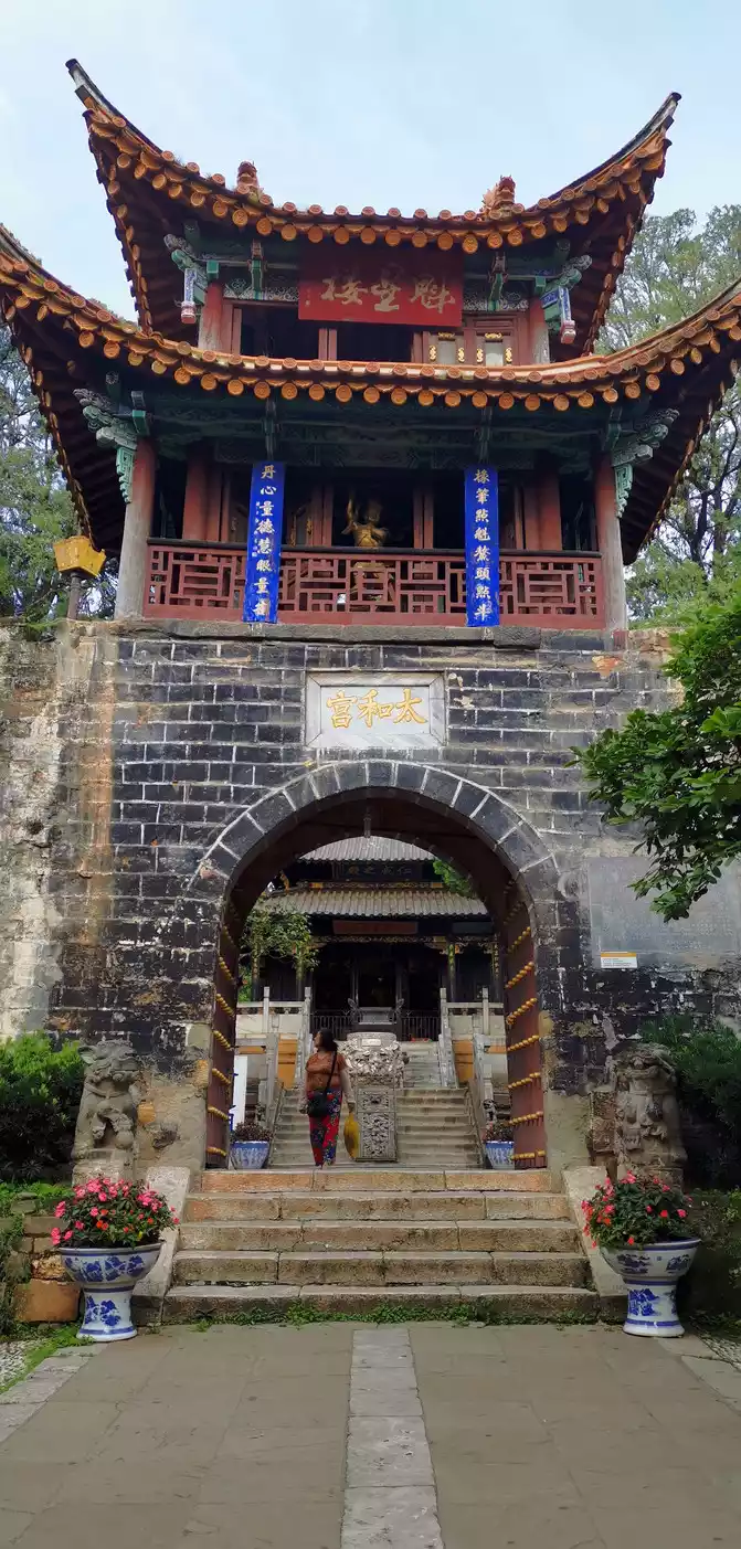 "Dianchi Lake can not be going, but the Golden Hall must come", this is the charm of the Golden Palace. The Golden Hall is the main building of the scenic area, which is a square building with a heavy eaves flying pavilion imitation wooden structure, with delicate carvings, well-proportioned proportions, and beautiful shapes. All components of the temple are cast in copper, consuming a total of 250 tons of copper, which is the largest pure copper building in our country. The bronze cast Zhenwu Emperor enshrined in the Golden Hall Hall is very conspicuous. The legendary Zhenwu Emperor was the son of Pangu, who served as the third Heavenly Emperor after the Jade Emperor's abdication, and gave birth to the two emperors of Yan and Huang, who was born as Fuxi. The Zhenwu Emperor enshrined in the temple is generally sitting on the hall with his hair down and barefoot, and there are two generals of turtles and snakes, or golden boys and jade girls. It is said that the former is the guardian god, and the latter is dedicated to recording the good and evil merits and demerits in the three realms for Zhenwu. But the Zhenwu Emperor of the Kunming Golden Hall is different, and folklore says that this shape resembles Wu Sangui, the king of Pingxi, which shows his ambition to become emperor.