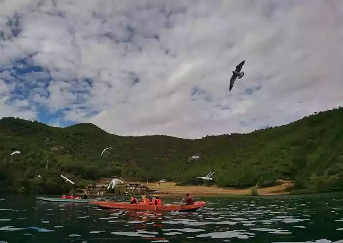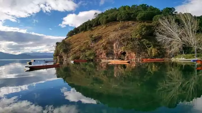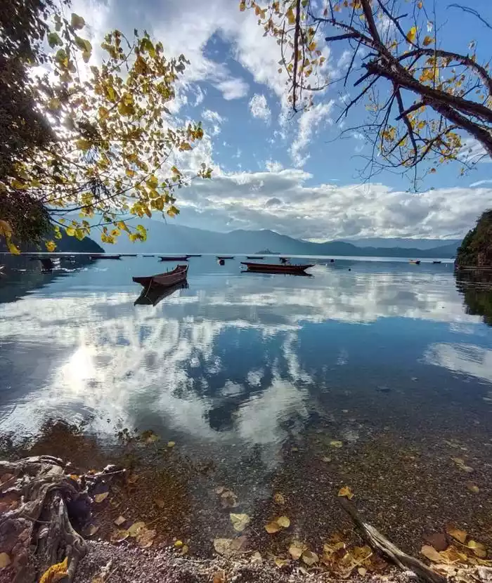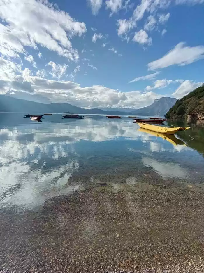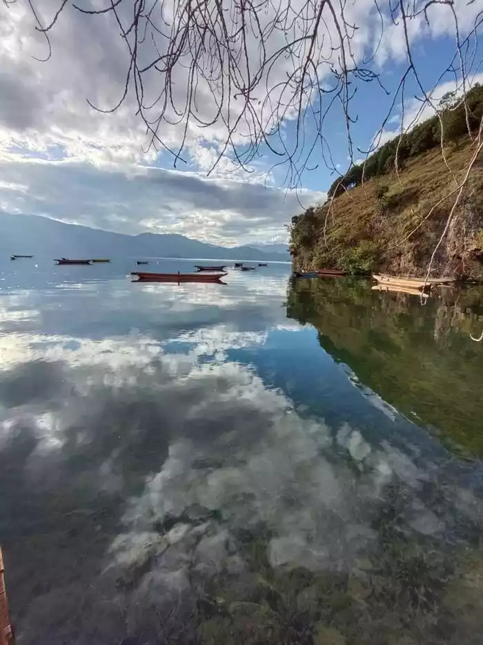 Thephotos of Lugu Lake do not need to be filtered at all, and the natural scenery is already very good. My favorite is Goddess Bay here, where the sky grows in the water and the birds fly in the water. This is the real mirror of the sky.
