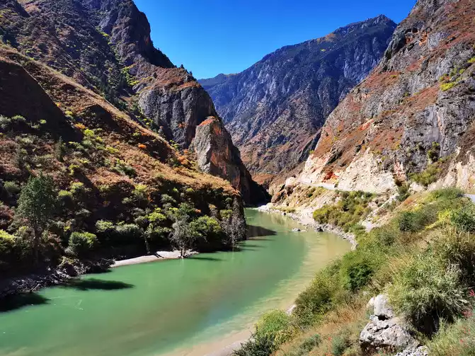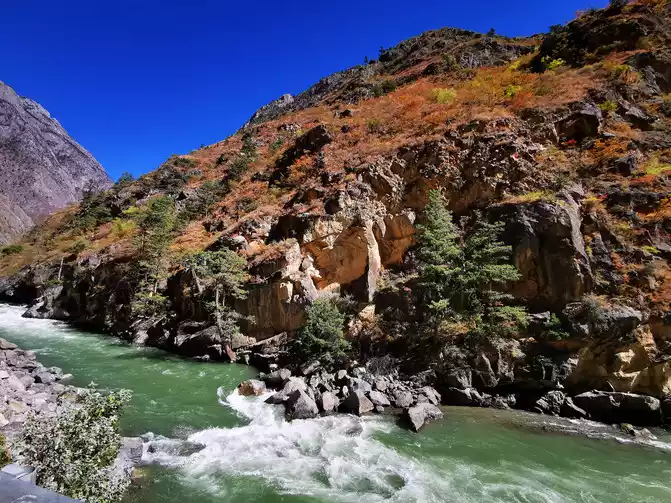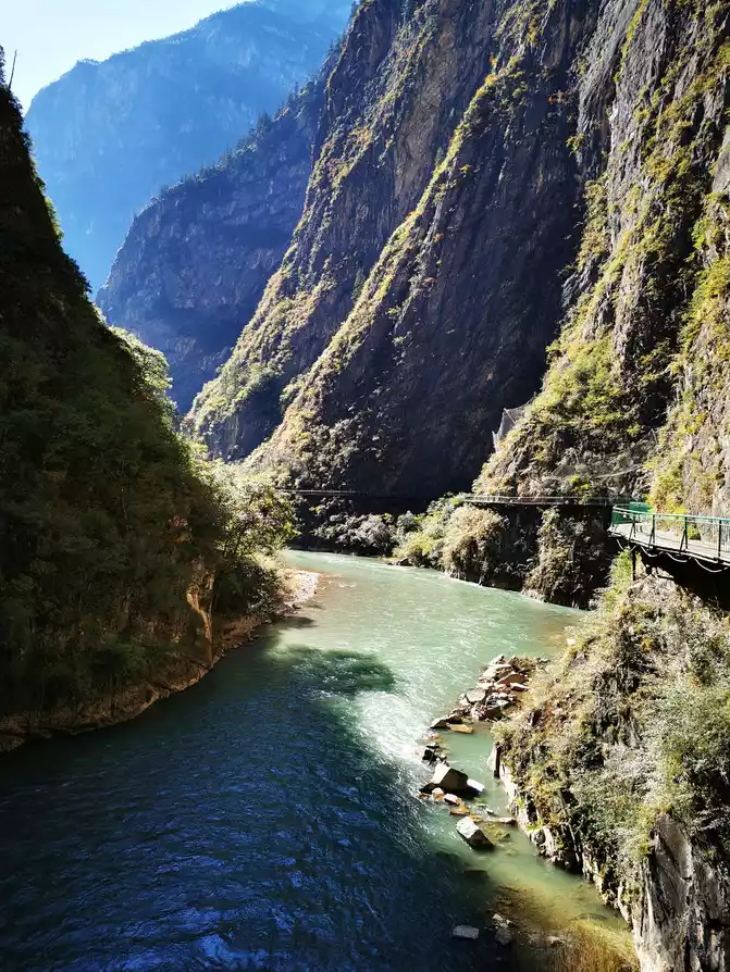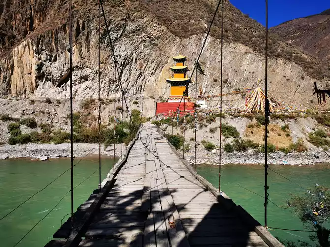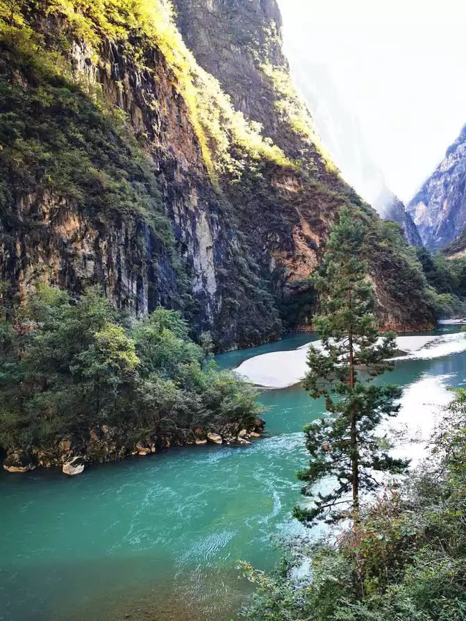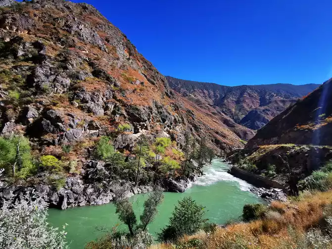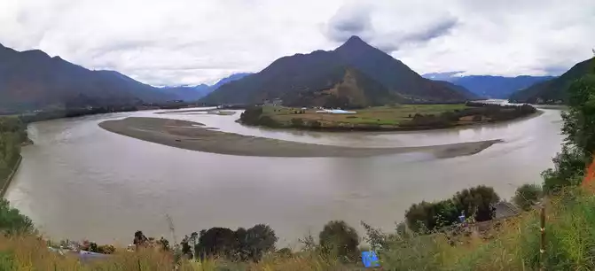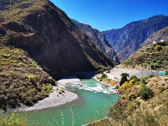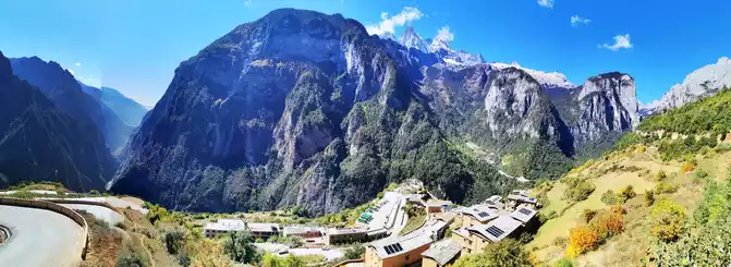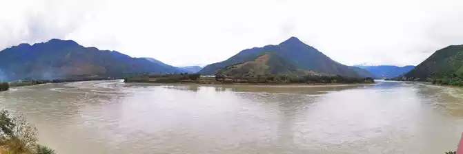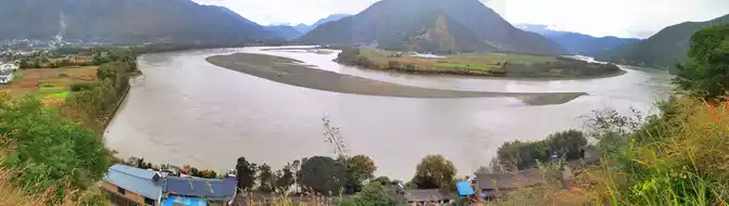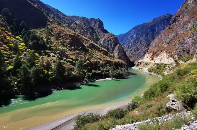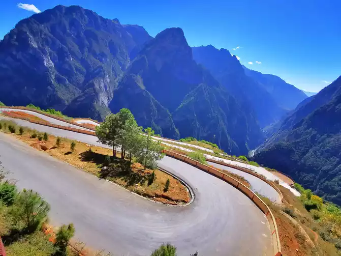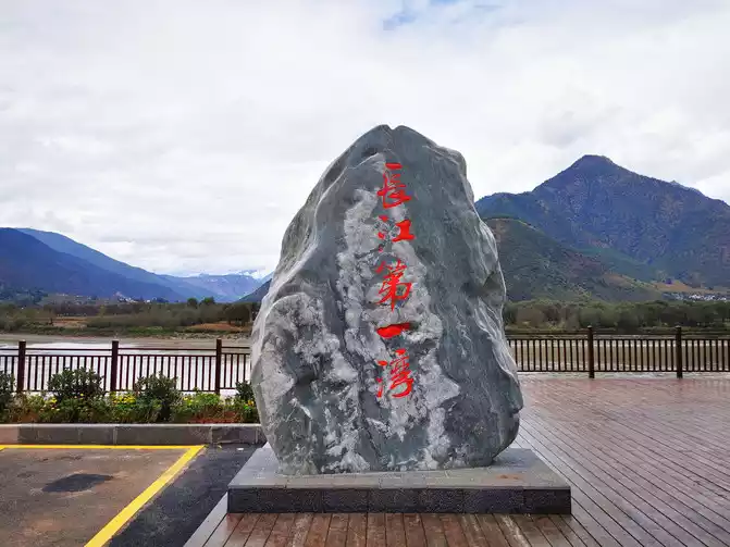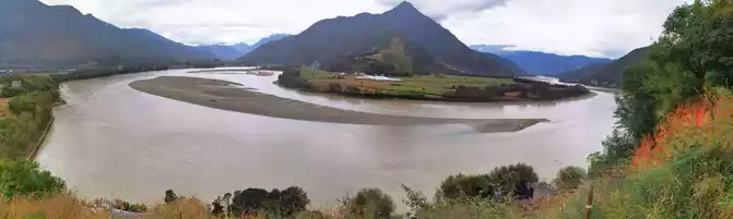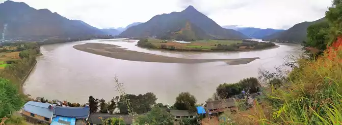 1850 meters above sea level, between Shigu Town, Lijiang and Shasongbi Village, Shangri-La City. The Yangtze River rushes down from the Qinghai-Tibet Plateau, the roof of the world, and makes a sharp 100-degree turn at Shasongbi Village, flowing northeast and forming a V-shaped bend here.