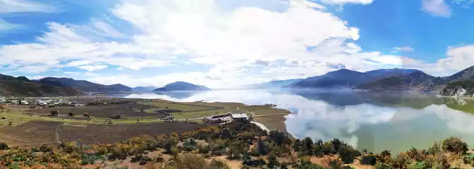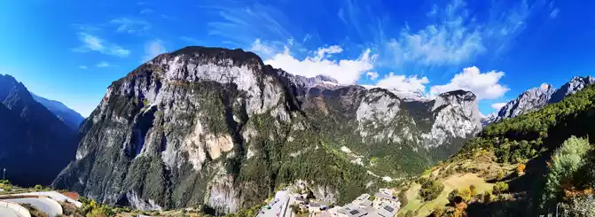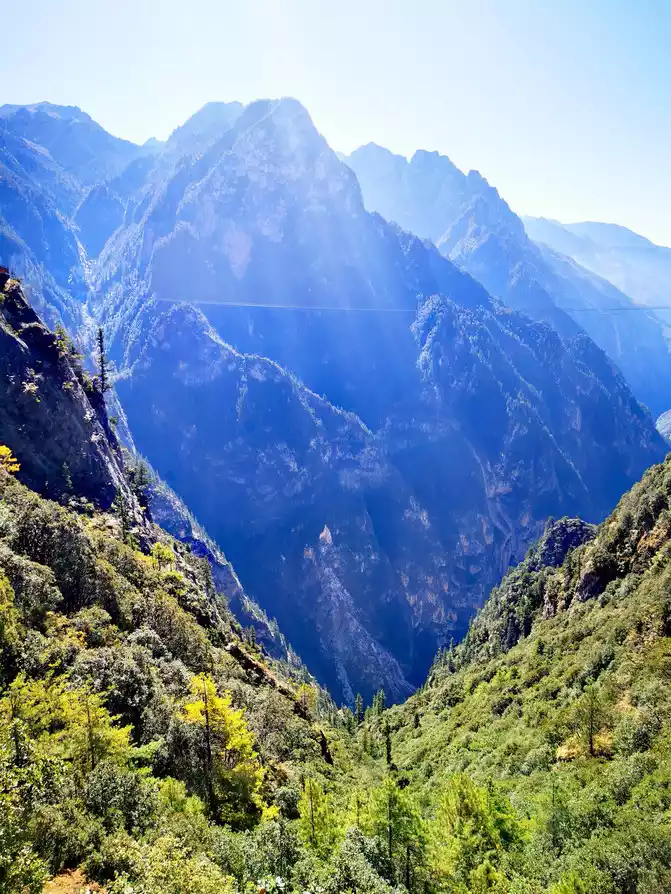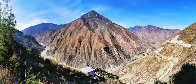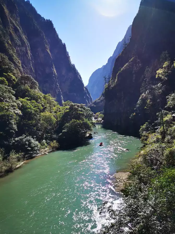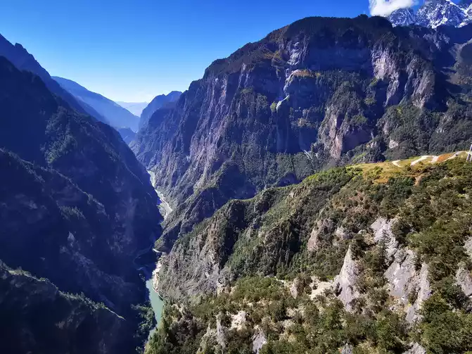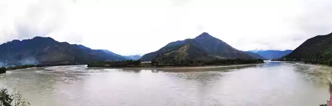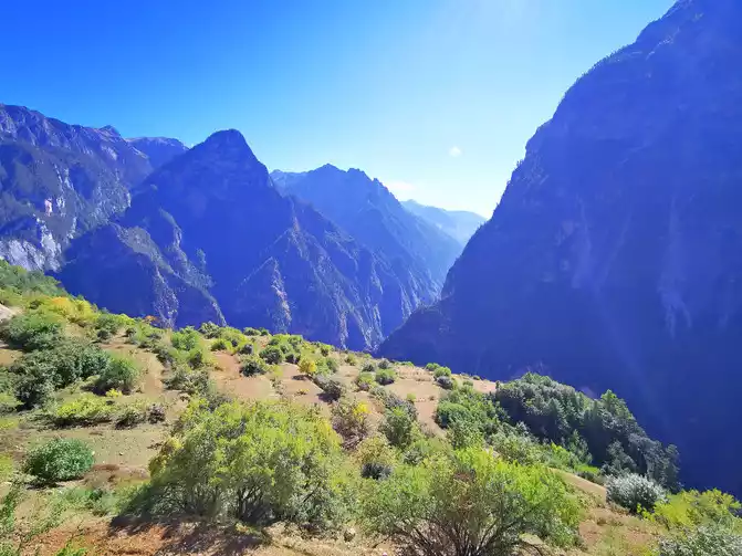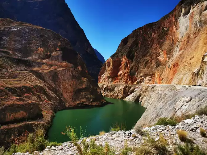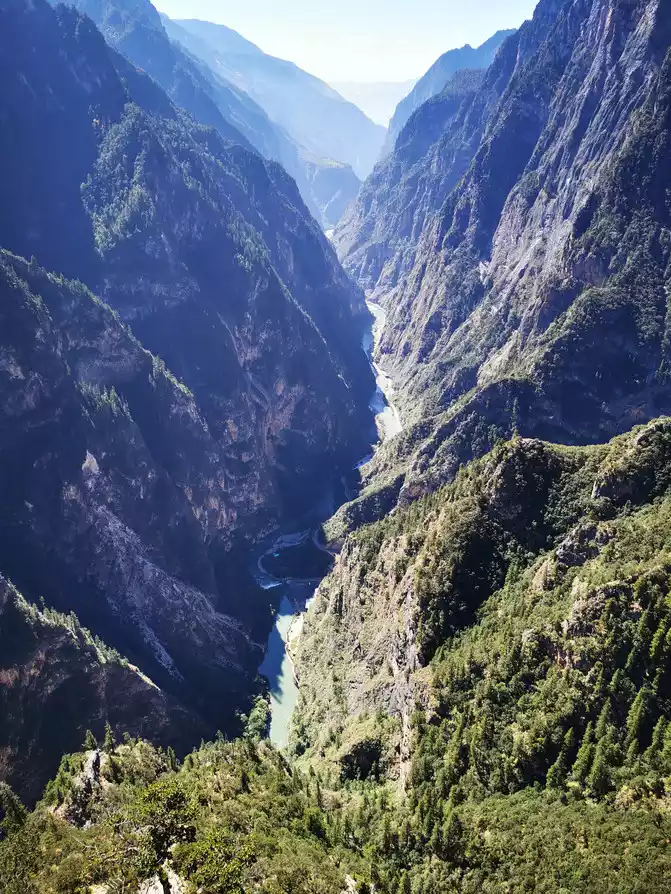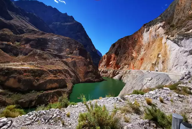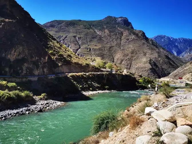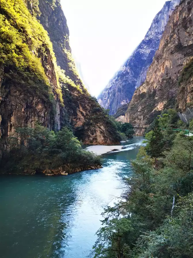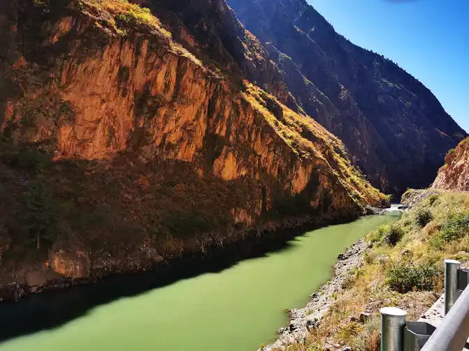1850 meters above sea level, between Shigu Town, Lijiang and Shasongbi Village, Shangri-La City. The Yangtze River rushes down from the Qinghai-Tibet Plateau, the roof of the world, and makes a sharp 100-degree turn at Shasongbi Village, flowing northeast and forming a V-shaped bend here.