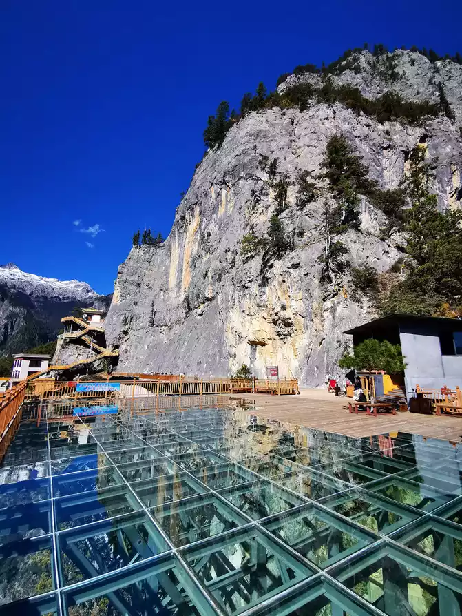 After entering the door and passing through the covered bridge, there is a viewing platform, which is the best place to take reflections. When the weather is clear and windless, 9:00~10:00 or 16:00~17:00 is suitable for capturing the reflections of snow-capped mountains.