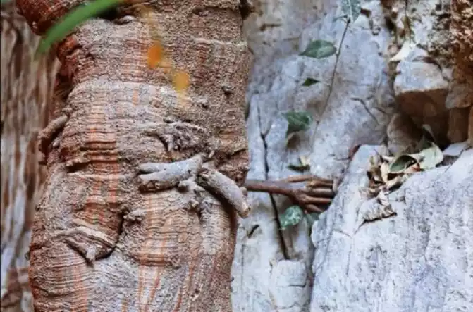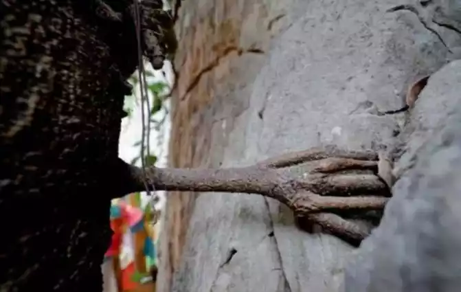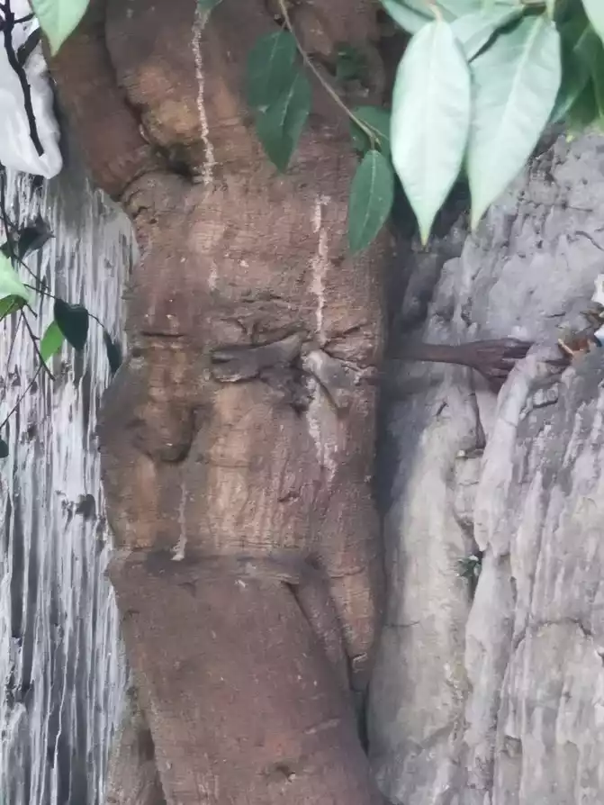 This thousand-year-old bodhi tree once grew a left hand overnight. Approaching the base of the Bodhi tree, you can see the legendary Buddha's hand. A brown trunk juts out diagonally from the tree, its fingertips reaching into the rock face. The five fingers are distinct, yet rough to the touch, as if grasping the hand of an elderly man. On the trunk, there resembles an elderly man's face. "There is no Bodhi tree, nor is there a mirror stand. Originally, there is nothing, where can dust gather?" This famous Buddhist verse, to comprehend it, is the ultimate enlightenment. Some interpret it as representing the state of mind of Shakyamuni Buddha as he sat in meditation beneath the tree. Shakyamuni is like a Bodhi tree, his mind like a bright mirror, undivided and naturally untainted by the dust of the outside world. From the waist of this thousand-year-old Bodhi tree, a "Buddha's hand" extends. From a distance, even the trunk of the tree looks like a human face. The hand of this thousand-year-old Bodhi tree reaches out over the cliff face, firmly grasping a rock in a crevice. While this might seem strange to many, it's incredibly powerful to Buddhists, as the Bodhi tree is a renowned Buddhist plant and holds a strong connection to the religion. I visited the site three times, and on the morning of the third day, just as I was leaving, I finally saw the "Buddha's hand." It was truly magical!