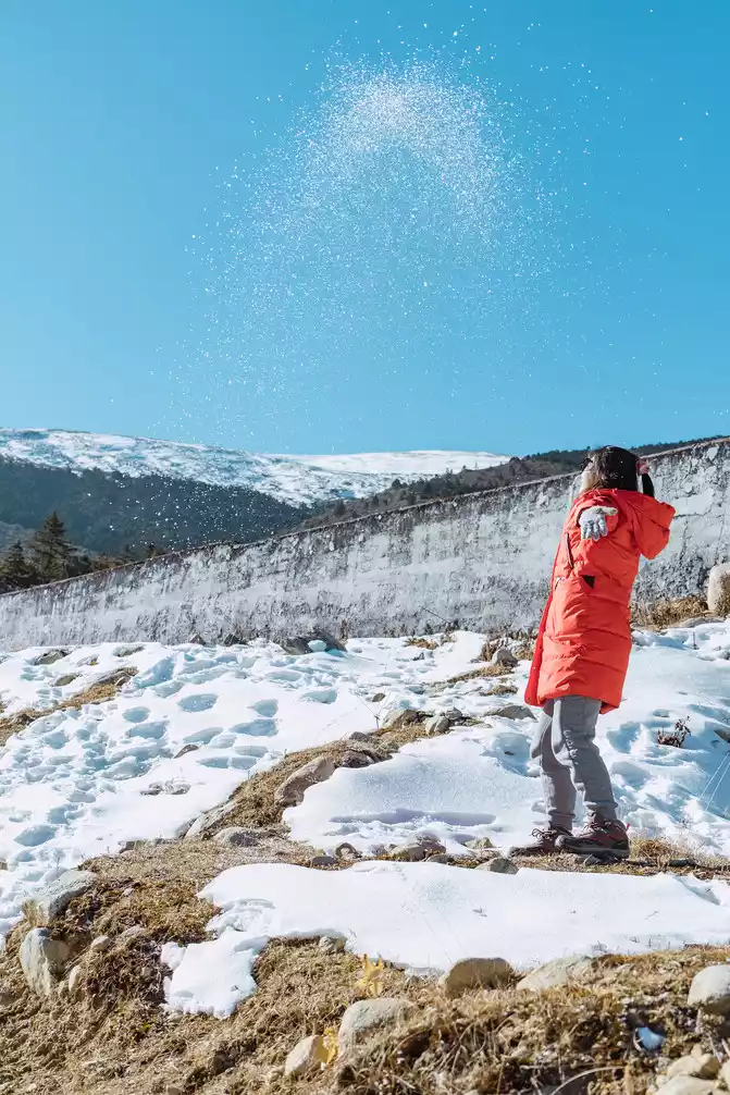 Along the way, we passed many high mountains, admired the Napa Sea, overlooked the White Horse Snow Mountain, and overlooked the Jinsha River BayWinter feels peaceful, coinciding with the beauty of the sky, the sun is shining, we enjoy the green mountains and snowy peaks all the way, sometimes you can find villages and rivers scattered in the mountains as soon as you turn around, stop to take pictures when you see the good scenery, although you have been in the car for several hours, but you don't feel tired, and you are very excited. It snowed a few days ago, and the snow has not melted in some places, we have been playing for a while, we haven't played in the snow for a long time, the snow here is not as wet as we have seen in the south, it feels very dry, it is difficult to pinch into a ball, the snowflakes are very large, more like ice flakes, like ice after one game, and the next one, layer by layer, under the sunlight to shine a little bit, like crystal, very beautiful!