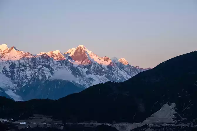 The highlight of the third day - see the Rizhao Golden Mountain! The first day the little brother gave us the sunrise timetable, starting at 8:00, we set up the camera at 7:45, in fact, we woke up before 7 o'clock, raised a few chickens next door, and began to crow before dawn, very hard, not stopping for a moment, more powerful than an alarm clock! When the sky was bright, the sky slowly turned white, the outline of the snow-capped mountains gradually became clear, cold and solemn, at 8:00, a bright color jumped out of a corner of the mountain, like unfolding a picture, the sun spread down from the top of the mountain, which lasted for almost 20 minutes, the whole mountain was immersed in the sun, the sky was bright, and a new day began!