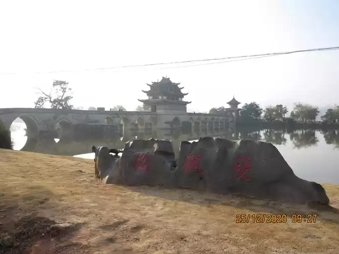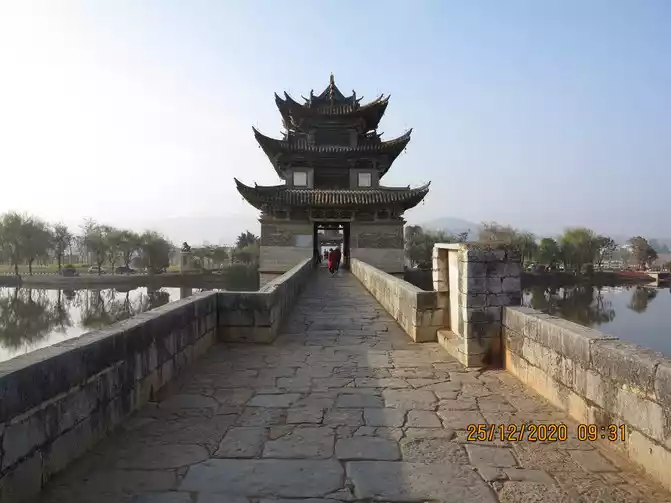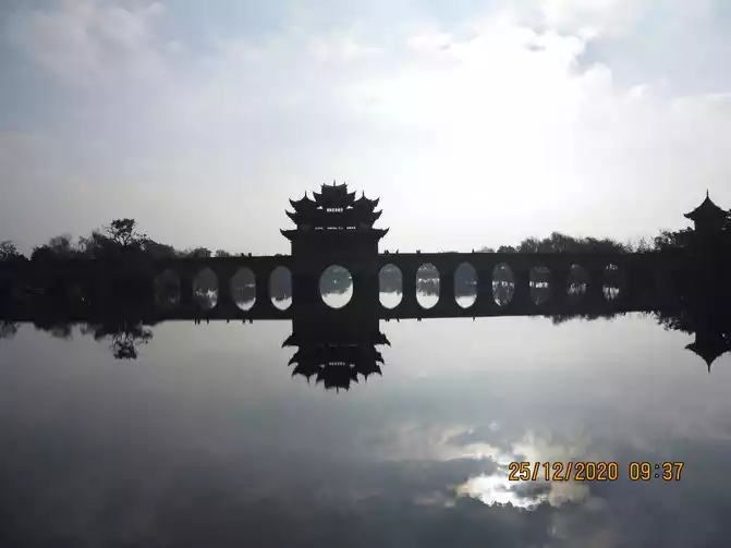 At nine o'clock in the morning and 2 in the afternoon, two buses, one round trip for 4 hours and 40 minutes, a bit of a roaming feeling, very comfortable. Get on the train at Lin'an Station, take pictures on the platform, and the carriage with a wooden feel is slow. At the first stop of the Shuanglong Bridge, the attendant on the bus will also lead the team to give a full explanation and go around the Shuanglong Bridge. This bridge is a well-known scenic spot in Jianshui, commonly known as the "Seventeen Holes Bridge", which is a three-pavilion and seventeen-hole stone arch bridge, spanning the water at the confluence of the Lu River and the Tachong River, and is one of the famous monuments in Yunnan Province, which has been included in the history of Chinese bridge building, which is very beautiful. Parking here is only about half an hour, which is enough.