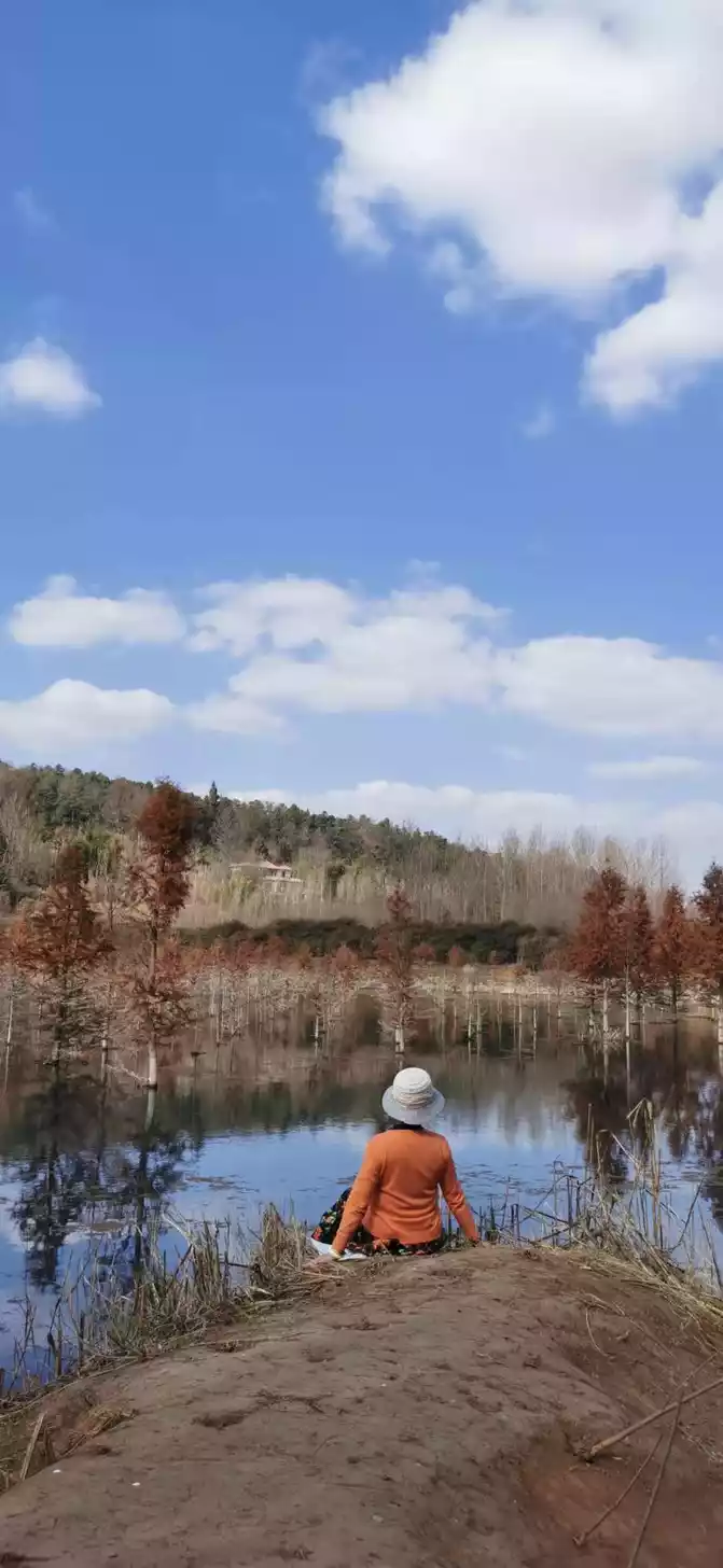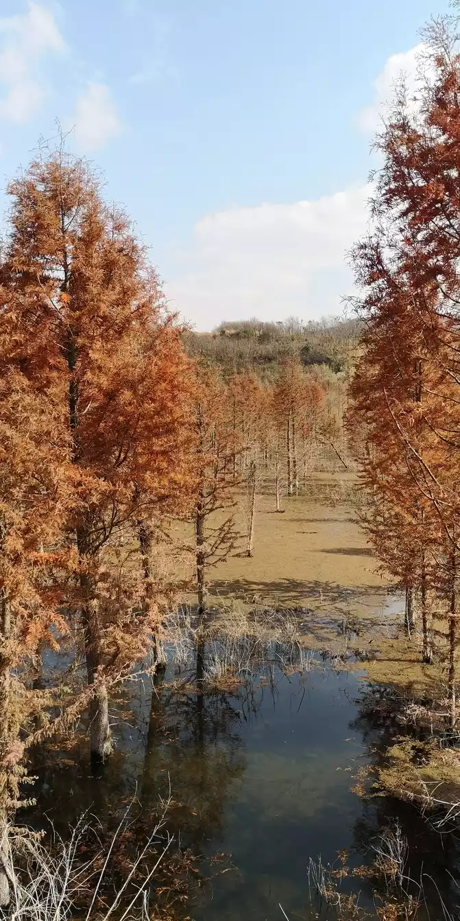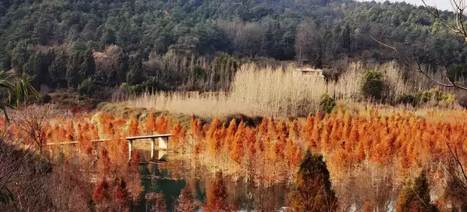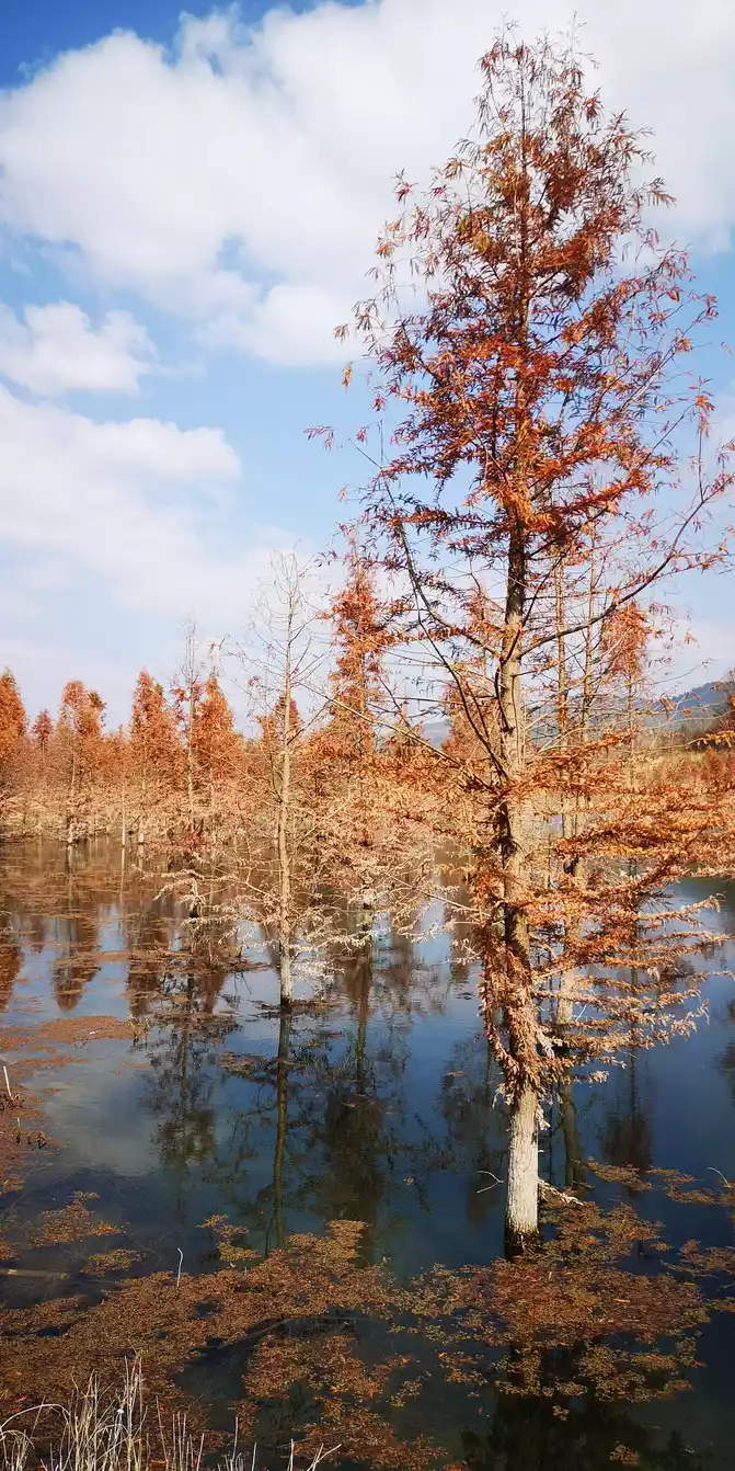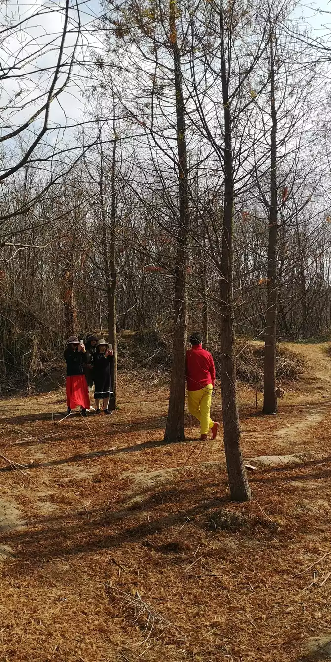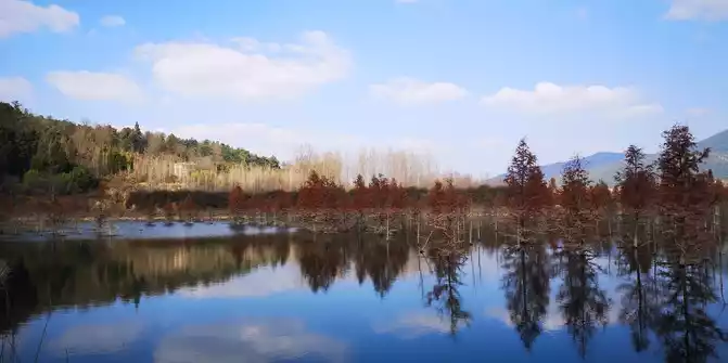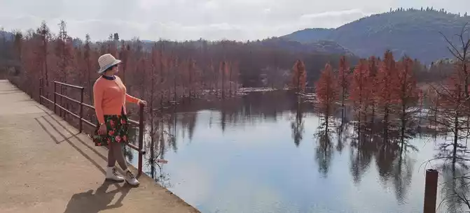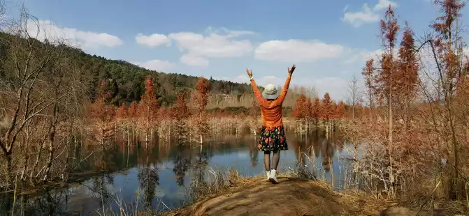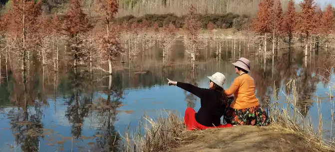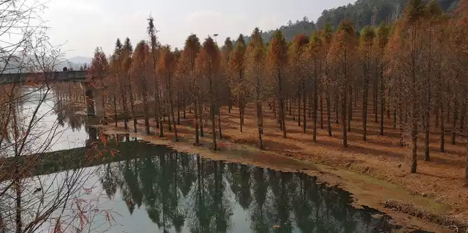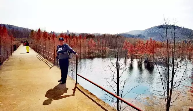 I was walking through the metasequoia forest, heard a voice, looked for the voice, and saw two old men fishing with a rod. I stepped forward to talk and knew that this was the Songhuaba Reservoir, and the reservoir would flood the metasequoia forest in November every year, with the purpose of purifying the water quality, and in March of the following year, water was released to cultivate the fields, and the metasequoia forest grew young leaves and restored green. Ah, fortunately, I didn't go around the lake, this is a reservoir, and it is almost impossible to walk back!