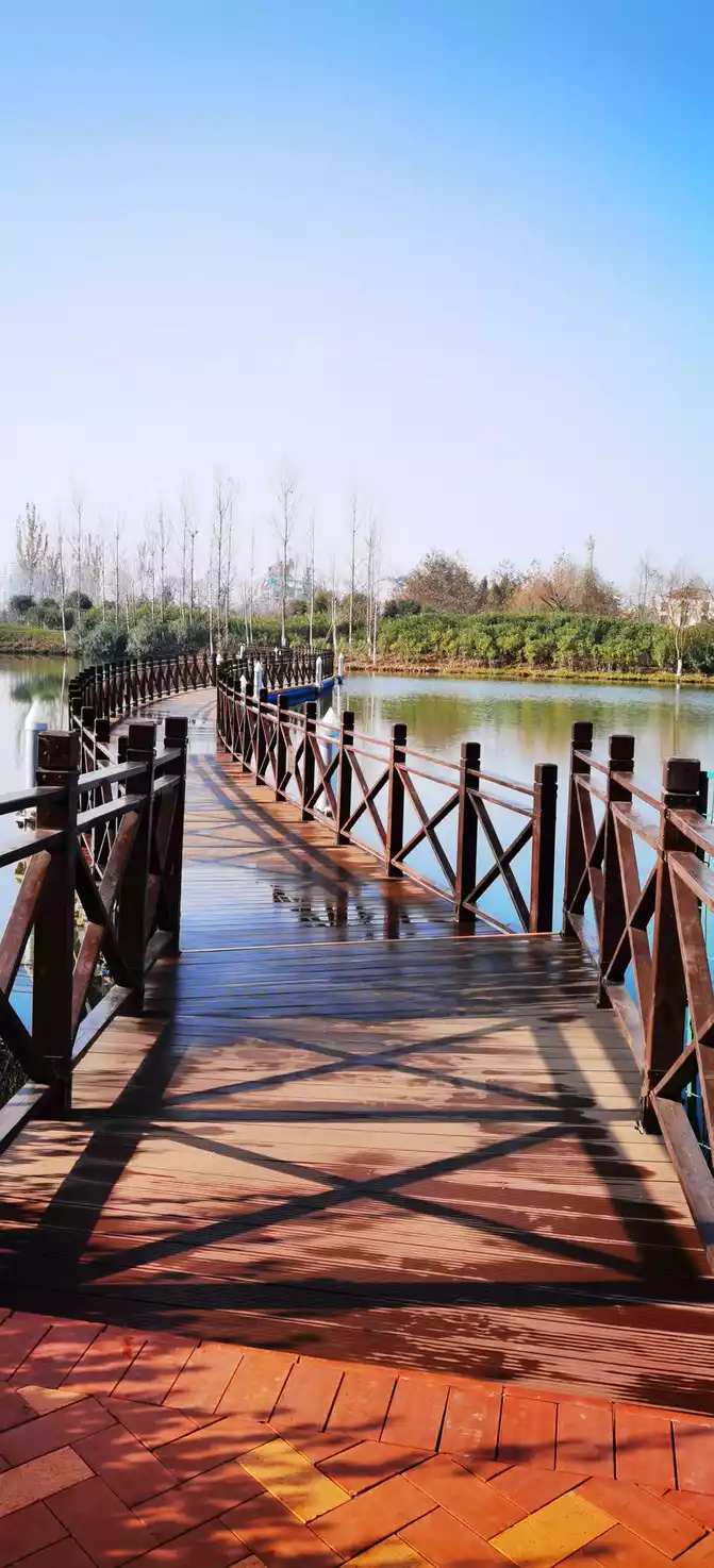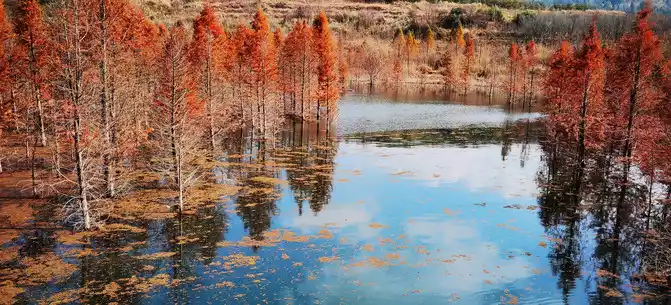 Wow, the view in front of us was amazing. It is like a lake, the metasequoia trees grow in the water, the leaves are all red, the sky is blue, the water surface is also blue, the sun, the breeze, the water surface is sparkling, and a white bridge is vaguely seen through the metasequoia forest. Where have we ever seen such a stunning beauty, cheers, screams are endless, and more importantly, there is no one else here except us, it is completely our private place.