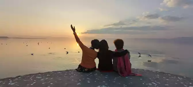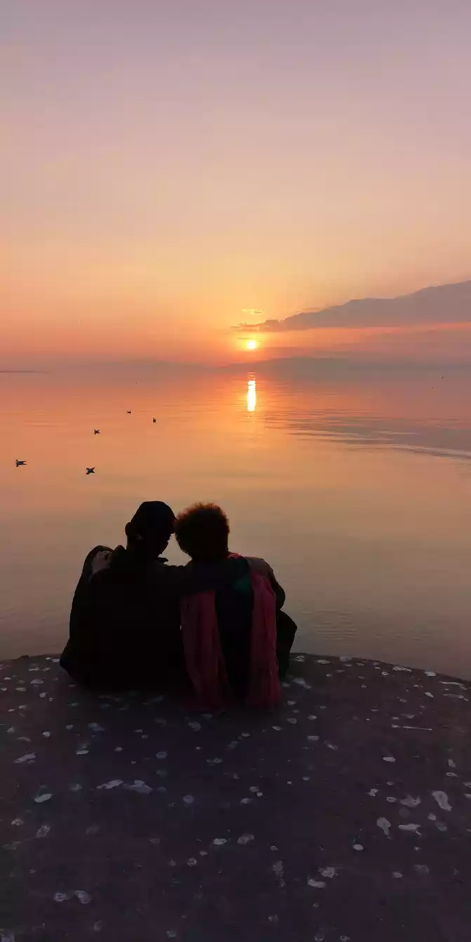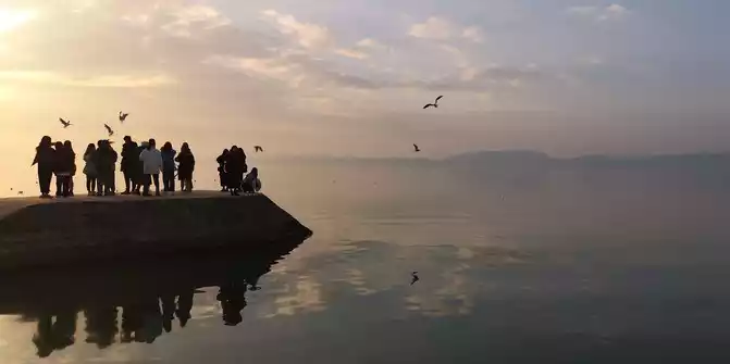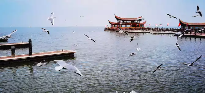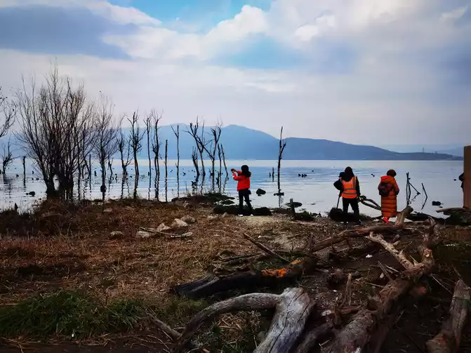 When the car drove into Haiyan Village, the road was very tortuous and narrow, and there would be vehicles parked in a slightly wider place, and it was impossible to meet the car in the alleys of the village. There are also many villagers in the center of the village who set up barbecue stalls, where many people eat baked tofu and baked potatoes. When we were worried that the car could not stop, the villagers enthusiastically instructed us to park the car in front of his house and charge a parking fee of 10 yuan. Then tell us that the time is almost up to follow this trail to watch the sunset by Dianchi Lake. This is a photography base, and there are many people watching the sunset, and parking fees are already a kind of livelihood for local villagers. We happily gave the parking fee and thanked the villagers for looking at the car for us and walking quickly towards Dianchi Lake. It turned out that there were already many people here, and in order to allow tourists to see the sunset, the villagers also specially built a long cement plank road, extending to the center of Dianchi Lake, and many people stood densely on the plank road. This season is the Siberian red-billed gull flying to Yunnan for the winter, and tourists are taking pictures of the red-billed gull, although the wind is gradually picking up at this time and the night cold is returning, and the excitement of watching the sunset makes us completely unaware.