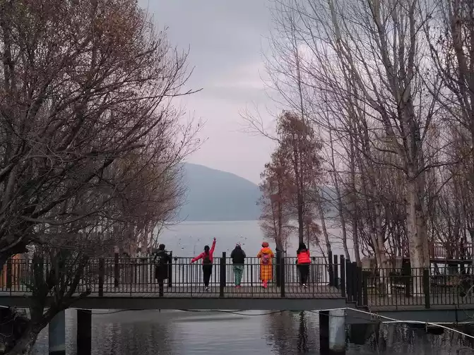 I slid along the steep path by the lake to the other side of the lake, taking a long-distance shot of the bridge and my friends on the bridge. I originally wanted to go around the lake, but it was too far away from my friends, so I just walked to the other side and returned.