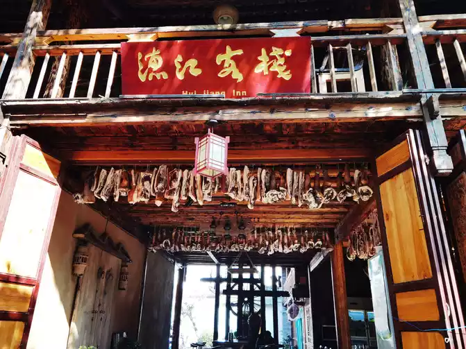 After parking the car in the parking lot, we entered the ancient town. The beams of the Shaxi Inn are covered with cured meat, which looks like they are prepared for the Spring Festival.